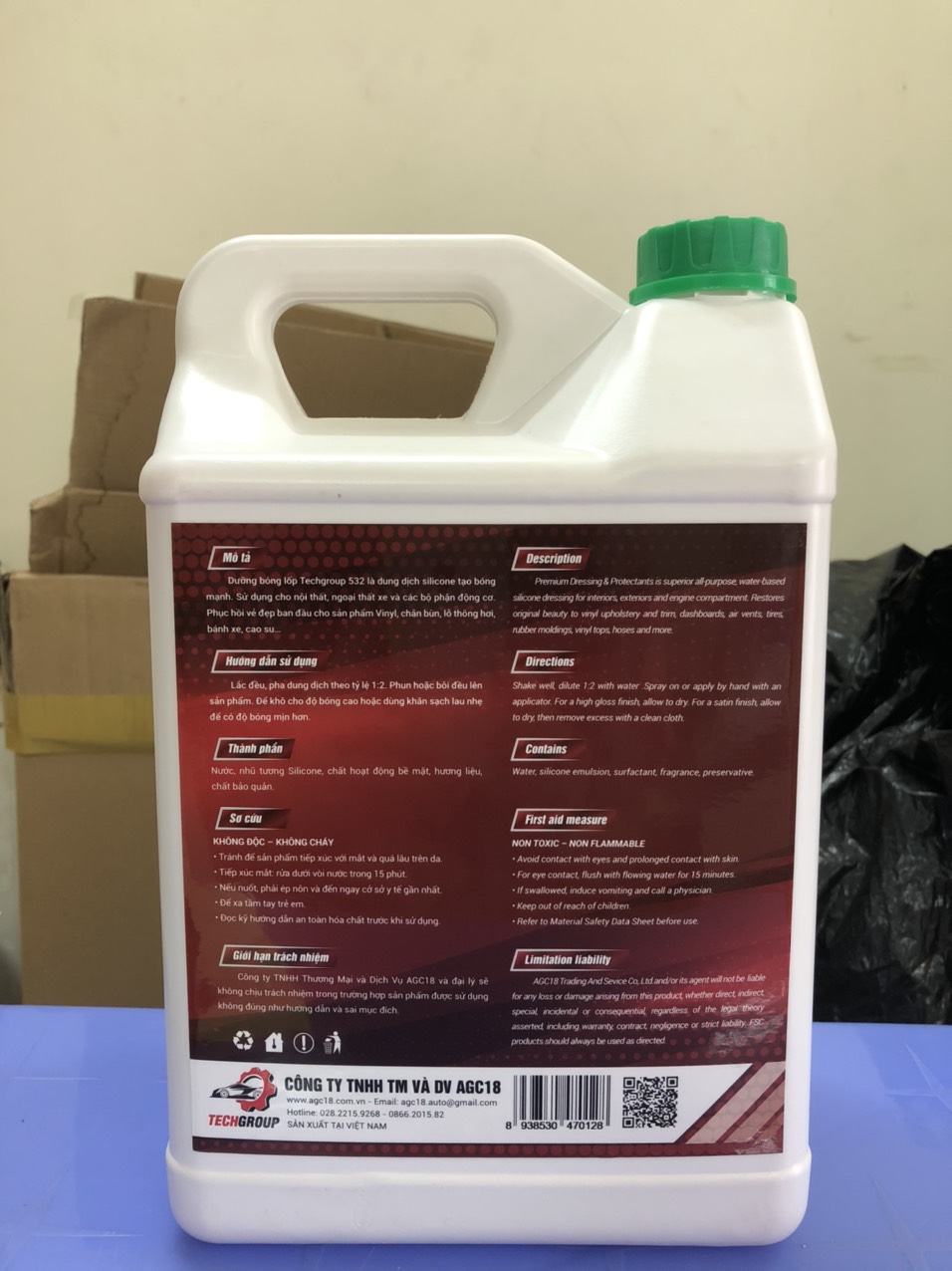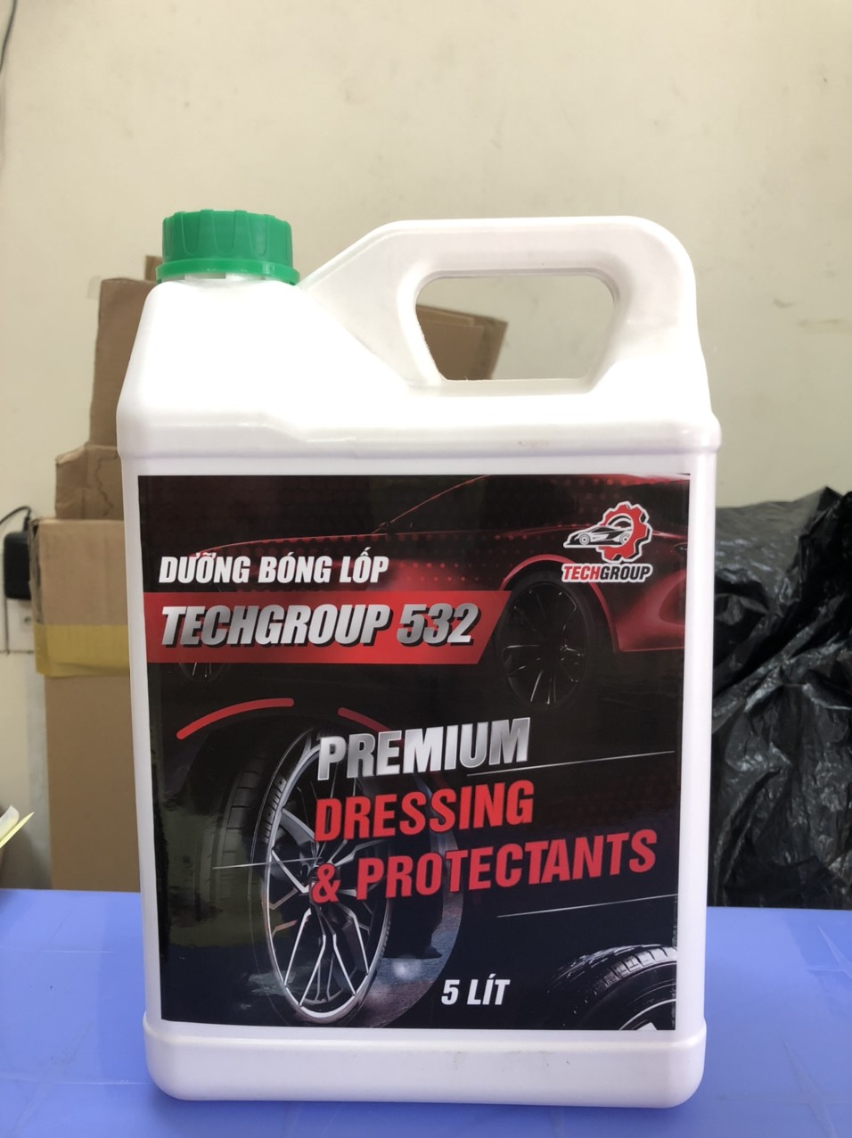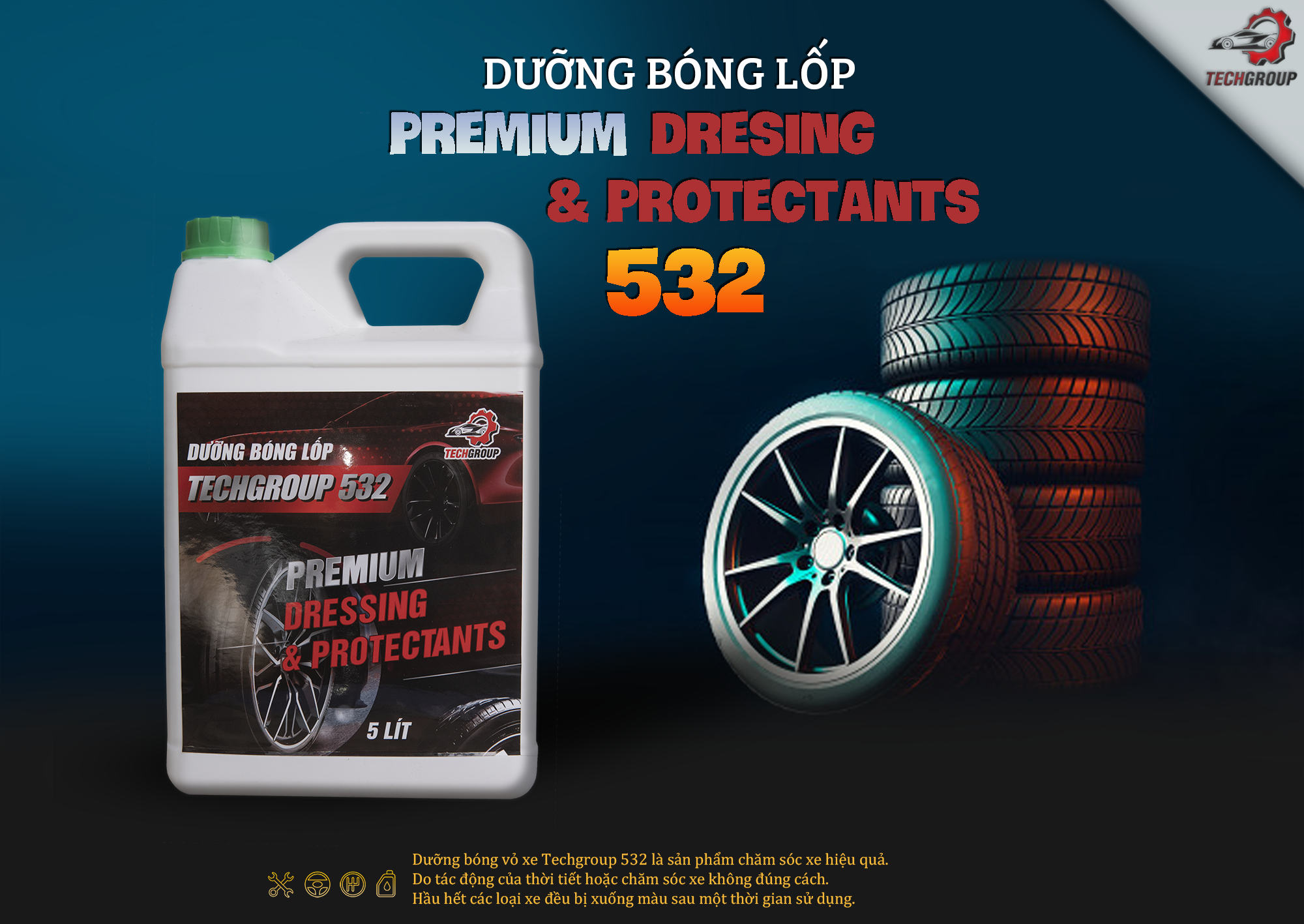 - Hướng dẫn sử dụng dung dịch dưỡng bóng chuyên dụng Techgroup 532 Pha dung dịch theo tỷ lệ 1:2, rồi lấy chổi hoặc mút quét dung dịch lên bề mặt lốp ( vỏ xe).