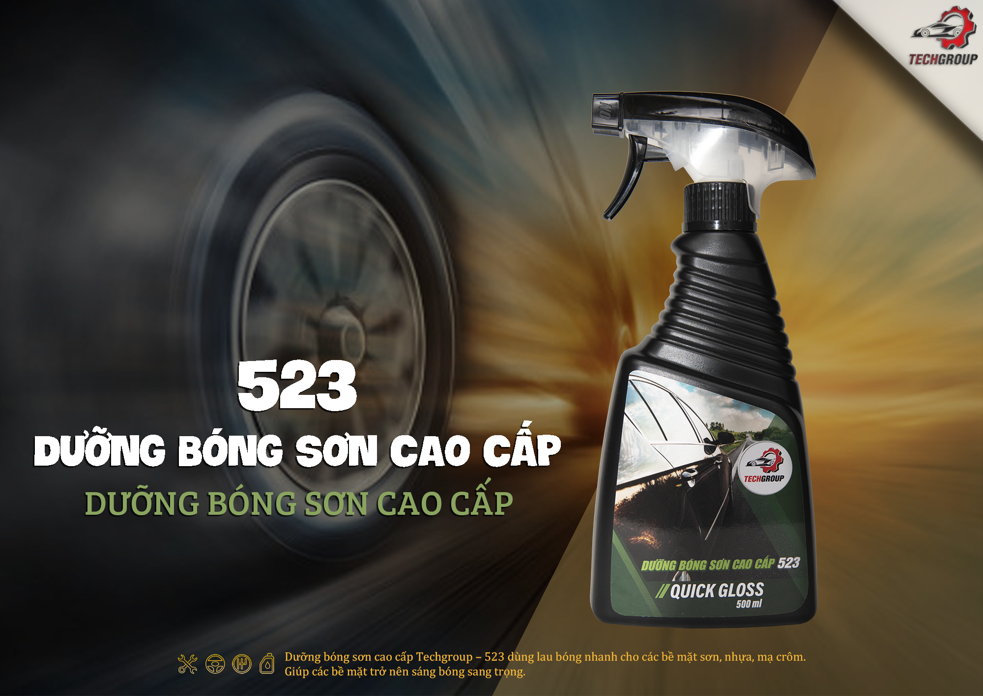 Dưỡng bóng sơn cao cấp Techgroup – 523 dùng lau bóng nhanh cho các bề mặt sơn, nhựa, mạ crôm. Giúp các bề mặt trở nên sáng bóng sang trọng. 1.  Tính Năng : – Dễ lau chùi: Một lớp sơn bóng trên bề mặt sơn sẽ giúp việc lau chùi, dọn dẹp vết bẩn trở nên dễ dàng hơn. . Chỉ cần lấy khăn lau nhẹ, vết bẩn có thể trôi đi, với những vết bẩn cứng đầu có thể dùng thêm dung dịch vệ sinh chuyên dụng. – Chống bám bụi: Độ láng mịn của sơn bóng sẽ giúp bề mặt sơn giảm ma sát, là lợi thế để bụi bẩn không thể bám lại. – Chống nấm mốc: Bề mặt bóng loáng của loại sơn này sẽ giúp bề mặt sơn không bị ẩm mốc. – Làm mới và tăng thẩm mỹ: Đây chắc chắn là công dụng khiến nhiều người thích dùng sơn bóng, bởi nó giúp bề mặt trở nên tươi sáng, có sức hấp dẫn và bền màu hơn. 2. Hướng dẫn sử dụng: Làm sạch chất bẩn trên bề mặt cần lau bóng. Lắc kỹ sản phẩm. Mở vòii phun về[ON] để chọn chế độ phun sương hoặc tia. Phun sản phẩm lên bề mặt rồi lau khô bằng khăn mềm microfiber. 3. Thành phần : Nước, silicon, sáp carnauba, hương. 4. Sơ cứu : Tránh để sản phẩm tiếp xúc với mắt và quá lâu trên da.Tiếp xúc mắt: rửa dưới vòi nước trong15 phút. Nếu nuốt, phải ép nôn và tham vấn ý kiến bác sĩ. Tham khảo bảng An toàn hóa chất trước khi dùng. 5. Lưu ý :