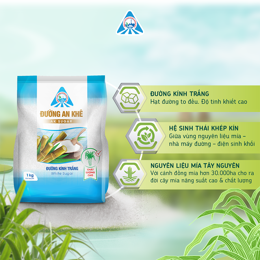 - Đường An Khê được sản xuất bên trong hệ sinh thái khép kín giữa vùng nguyên liệu - nhà máy đường - điện sinh khối, giúp tạo thành những hạt đường to đều có độ tinh khiết cao với giá cả phải chăng.