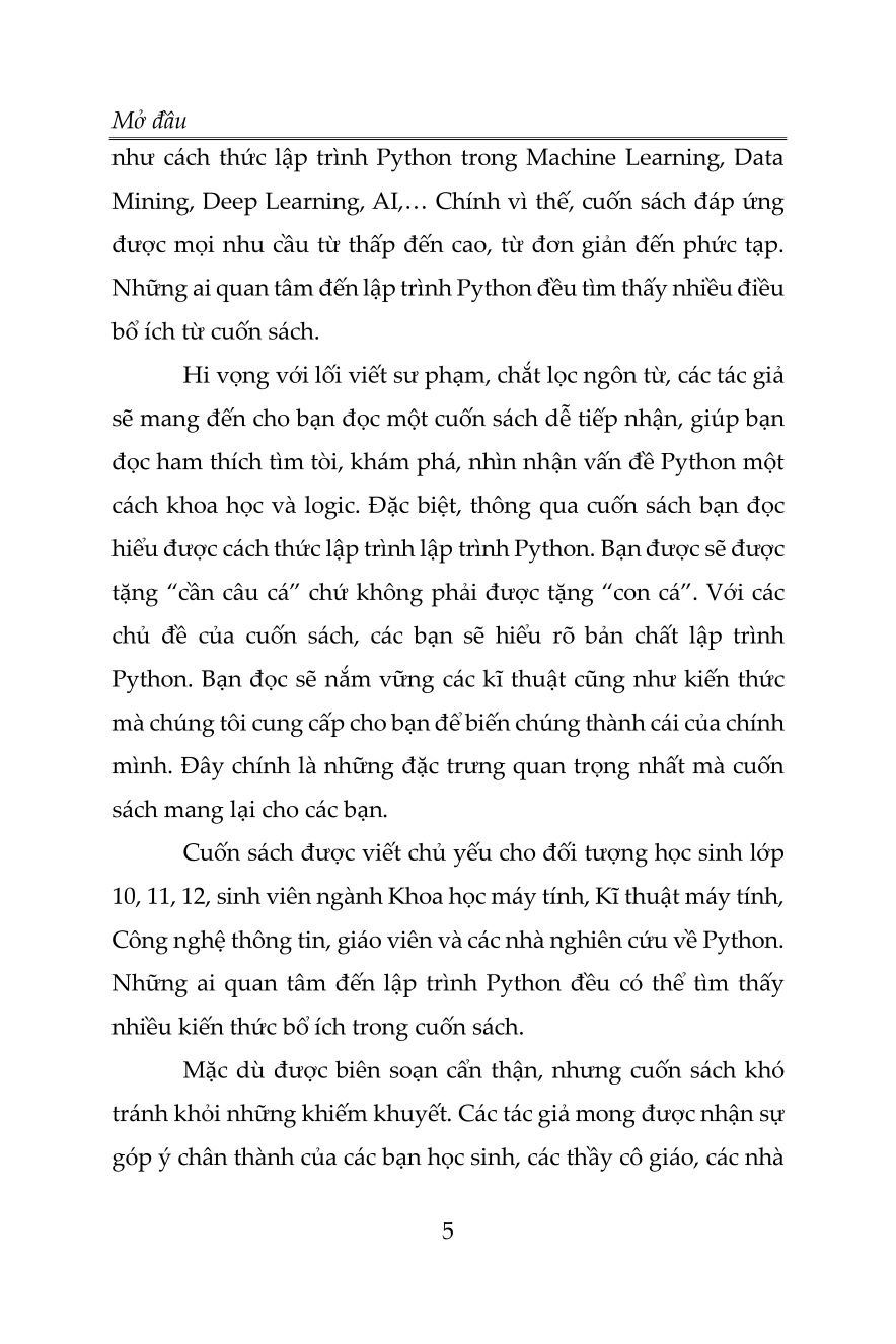 Trong bối cảnh cả thế giới bắt đầu bước vào thời đại mới đó là thời đại Trí tuệ nhân tạo (AI) thì lập trình đóng một vai trò hết sức quan trọng. Hiểu được lập trình chính là hiểu được bản chất cốt lõi của AI, Machine Learning, Data Mining, Deep Learning. Trong các ngôn ngữ lập trình thường dùng cho Trí tuệ nhân tạo thì Python là ngôn ngữ lập trình được ưa dùng nhất hiện nay. Python giúp người dùng xử lí dữ liệu, giải quyết các bài toán lập trình một cách nhanh chóng. Nó là ngôn ngữ lập trình tốt, dễ đọc và dễ hiểu. Python với các câu lệnh phong phú đáp ứng mọi nhu cầu của người học. Đặc biệt, tốc độ xử lí nhanh, hàm thư viện đa dạng, cộng đồng sử dụng lớn và mang tính toàn cầu đã làm cho Python có một vị trí hết sức quan trọng khi học lập trình. Ngôn ngữ lập trình này chính thức được đưa và giảng dạy ở Trung học phổ thông và trong tất cả các trường Đại học. Những điều vừa đề cập cho thấy cần thiết phải biên soạn thêm nhiều tài liệu tham khảo về lập trình Python.