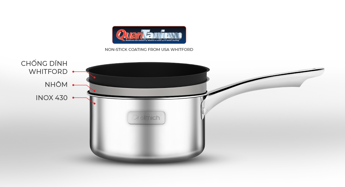Lòng quánh Trimax được phủ chống dính 3 lớp Whitford Quantanium màu đen ánh kim cho độ bền bỉ tối ưu. Đây là loại chống dính tuyệt đối an toàn cho sức khỏe, không chứa các chất có hại như PFOA, APEO. Chống dính Whitford đạt tiêu chuẩn FDA của Mỹ và được sử dụng trên toàn thế giới.