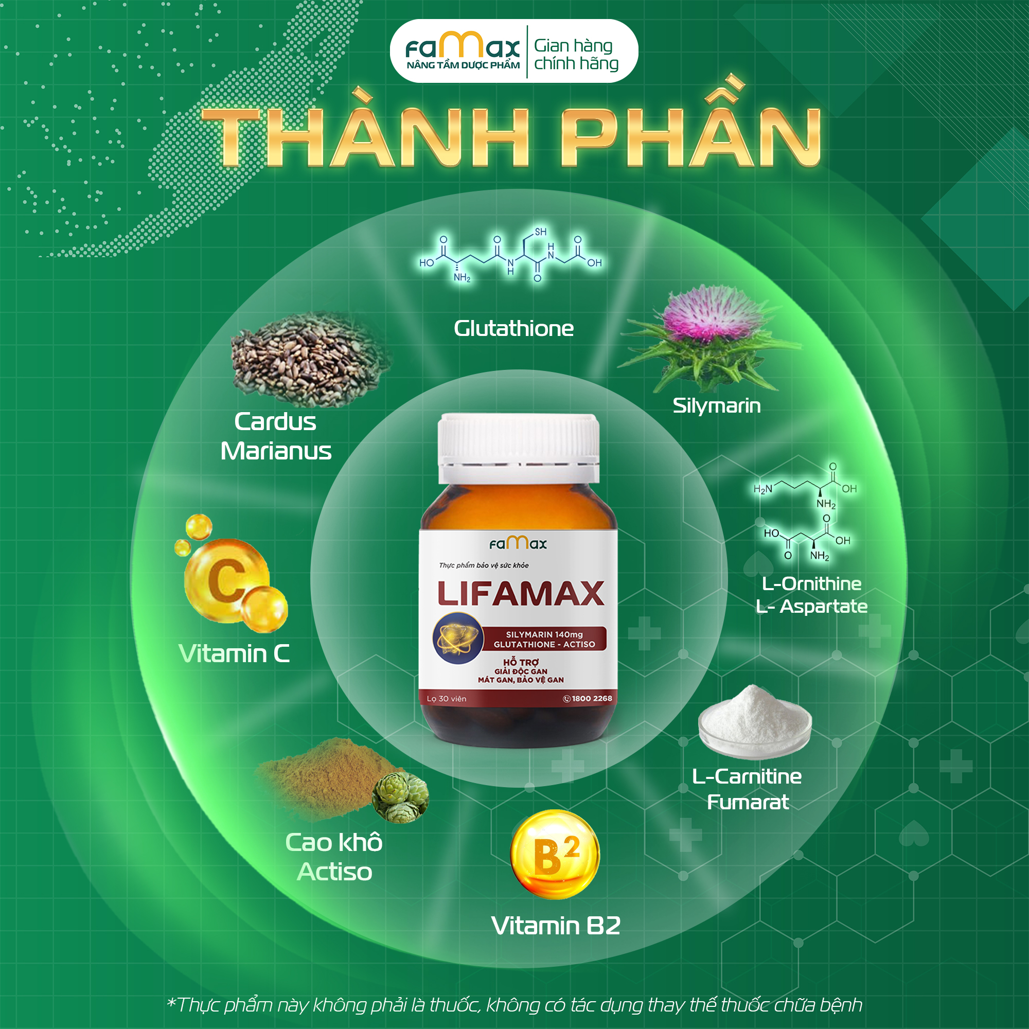 Mua tại TiktokTHỰC PHẨM BẢO VỆ SỨC KHỎE LIFAMAX Thành phần Trong 1 viên chứa: Glutathione…………………………………………………………………………… 150mg Silymarin……………………………………………………………………………….. 140mg (Cardus marianus extract 280mg) Cao khô Actiso (Cynara scolymus)…………………………………… 50mg (tương đương 2000 mg thảo mộc khô) L-Ornithine L- Aspartate……………………………………………………… 30mg L-Carnitine fumarat……………………………………………………………….. 10mg Vitamin C (Acid Ascorbic)……………………………………………………. 10mg Vitamin B2 (Riboflavin)………………………………………………………….. 2mg Phụ liệu: Chất độn (Lactose), chất ổn định (polyvinyl pyrrolidone (PVP K30)), chất bảo quản (nipagin, nipasol), chất chống đông vón (Magnesium stearate), vỏ nang (gelatin).