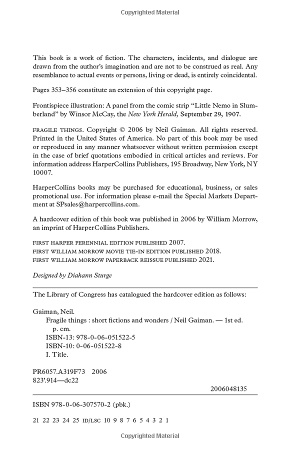 With breathtaking clarity, Fragile Things illumines Gaiman’s brilliance as well as his terrifyingly entertaining dark sense of humor. By turns delightful, disturbing, and diverting, this volume is a gift of enchantments that will startle the senses and stir the soul.