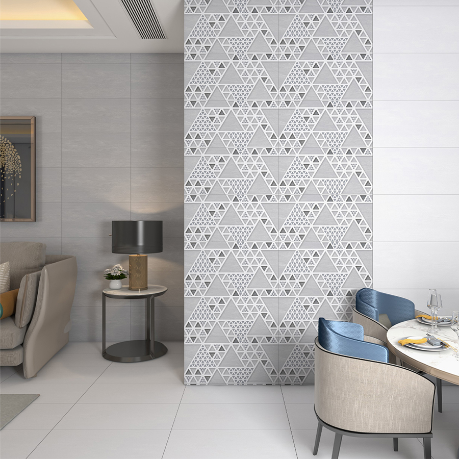 - Gạch có nền màu xám nhạt, với các hình tam giác màu trắng và xám đậm hơn. Sự kết hợp màu sắc này tạo ra hiệu ứng thị giác mạnh mẽ, nhưng vẫn giữ được sự thanh lịch và hiện đại.