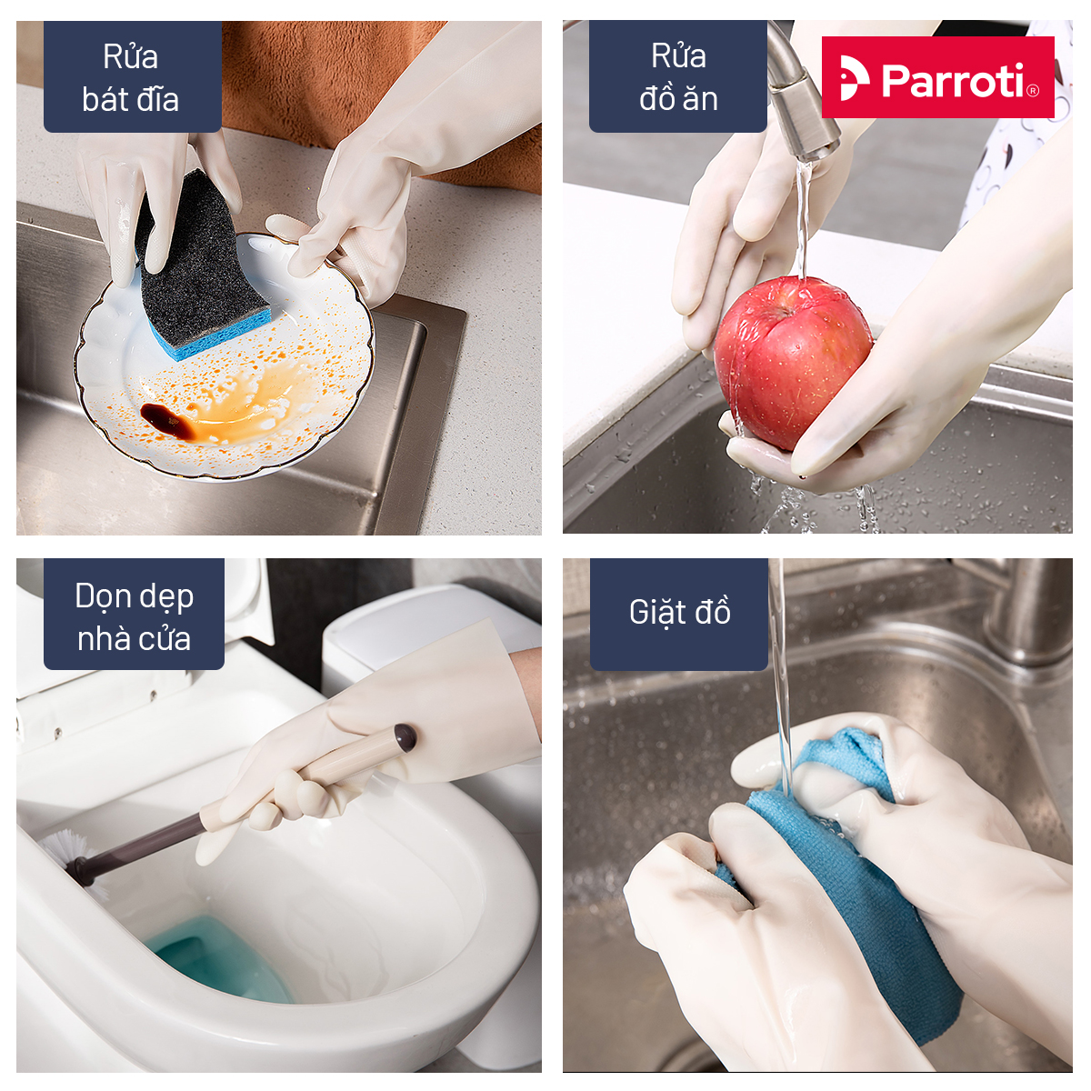 - Đa năng: găng tay cao su Parroti dùng để rửa chén, nấu ăn, giặt giũ hoặc vệ sinh nhà cửa