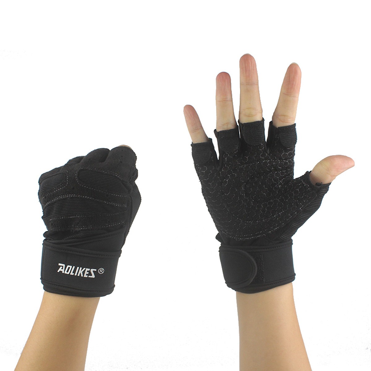 Găng tay Aolikes 113B cụt hở ngón, bao tay thể thao gym có cuốn cổ tay đệm lòng bàn tay gym đẩy tạ AOLIKES 113B (1 đôi) - Găng hở lưng thường - có cuốn