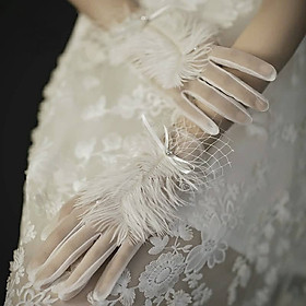 ✨Găng tay trong suốt đính lông vũ, ngọc trai và ren lưới cho Cô dâu và Dạ hội, đi tiệc, sự kiện, lễ hội, chụp ảnh MS: 43750