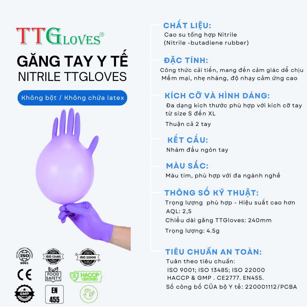 Mua tại TiktokGăng Tay Cao Su Y Tế Size L Không Bột Nitrile TTGLOVES Màu Tím (100 Chiếc) TTGLoves là thương hiệu găng tay của công ty TNHH Sản Xuất & Thương Mại Toàn Tâm Gloves. Sản phẩm găng tay y tế Nitrile của TTGloves đã khắc phục những hạn chế của găng tay Latex, mang lại sự dẻo dai, đàn hồi và thoải mái tuyệt vời cho người dùng. Hãy trải nghiệm và cảm nhận sự khác biệt mà chúng tôi mang lại. THÔNG TIN SẢN PHẨM