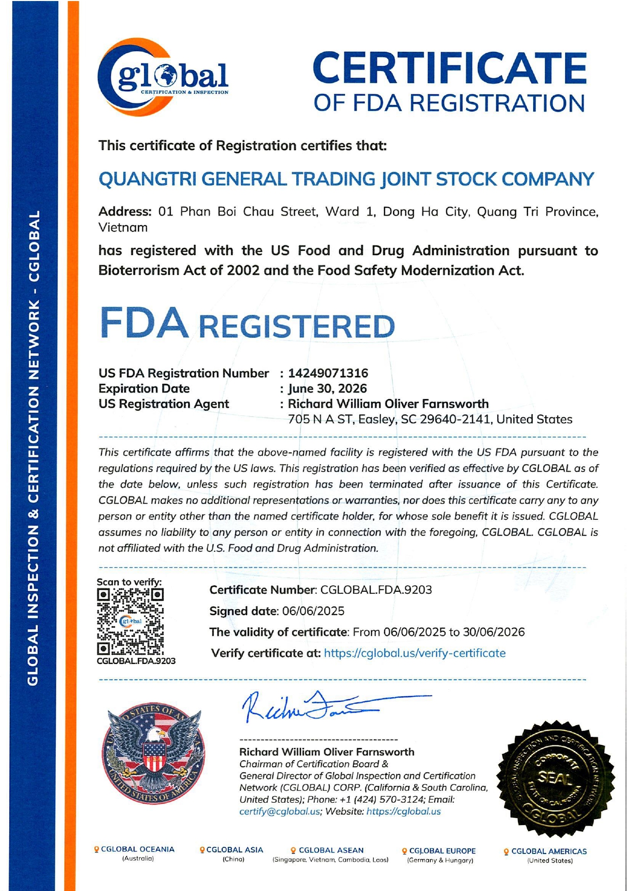 - Cơ sở sản xuất đã đăng ký FDA của Mỹ. (Xin vui lòng xem file đính kèm).