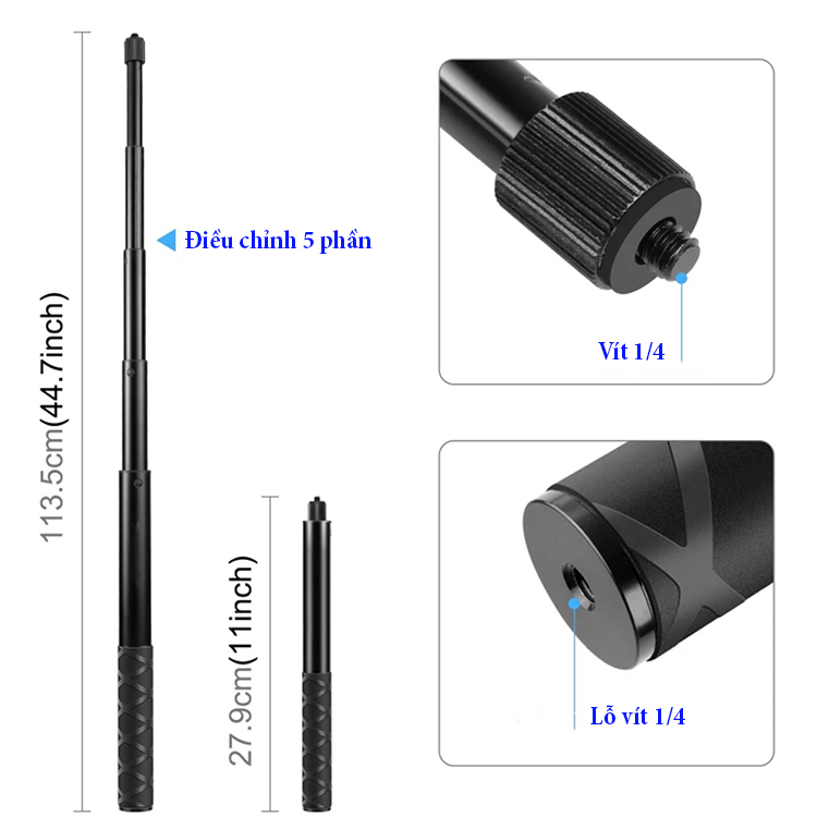 - Thiết kế 5 phần gậy selfie cho camera hành động có thể nối dài từ 27.9cm/11inch đến 113.5cm/44.7inch linh hoạt.