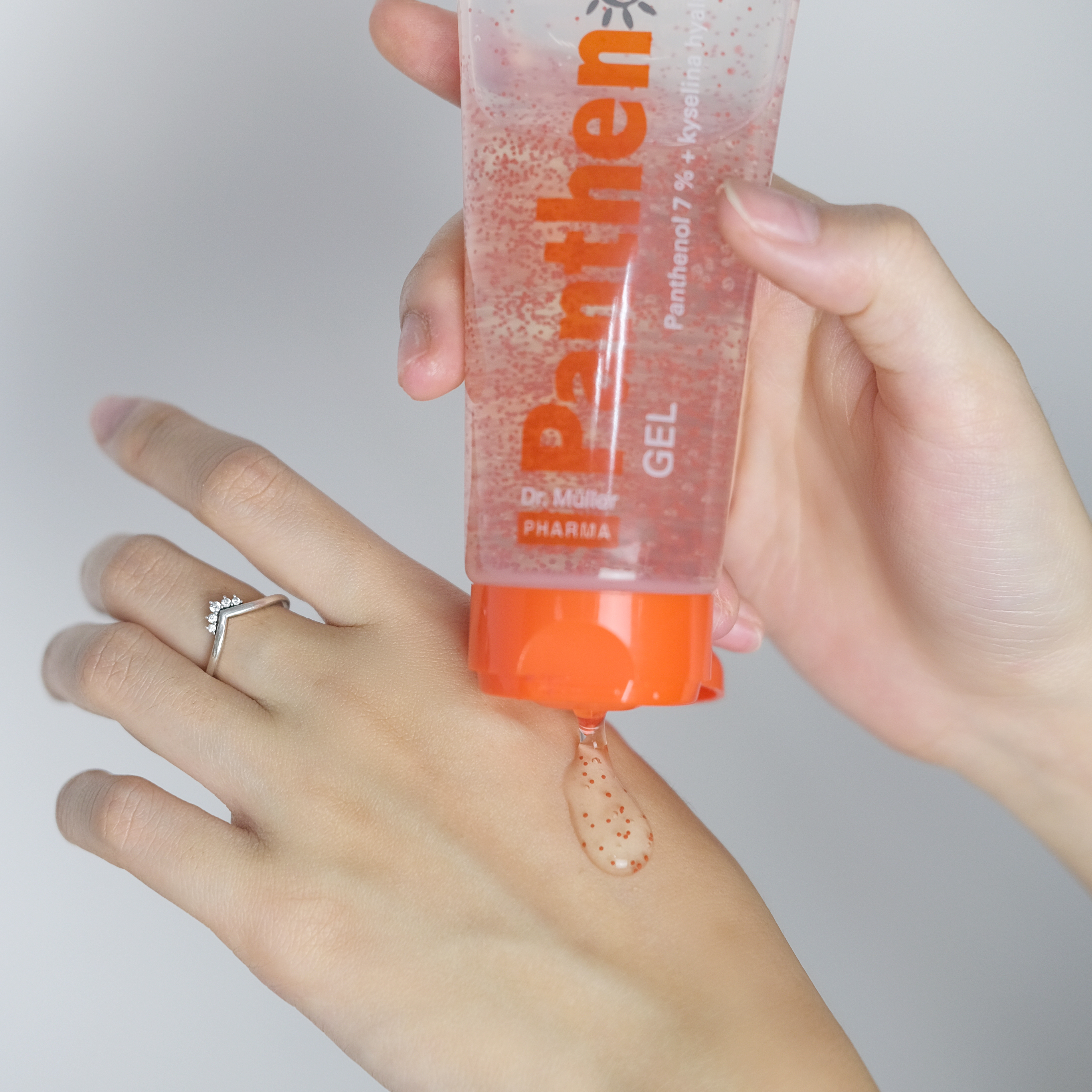 Gel dưỡng da phục hồi Panthenol của Dr.Muller có dạng gel sữa dịu nhẹ, thẩm thấu nhanh, không nhờn dính và dịu nhẹ cho mọi làn da, phù hợp với da bị cháy nắng, da