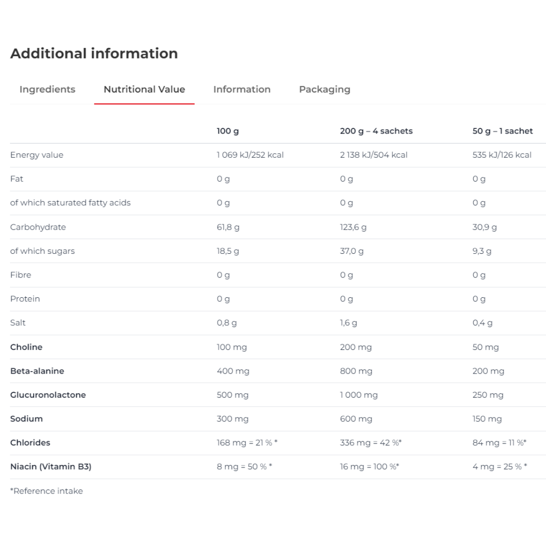 - Được nhập khẩu và phân phối độc quyền bởi Nutrition Depot tại thị trường Việt Nam và Châu Á. GEL NĂNG LƯỢNG CARBOSNACK SACHET – NẠP NHANH NĂNG LƯỢNG TỨC THÌ NUTREND là một thương hiệu uy tín và được tin dùng trong ngành thể thao và dinh dưỡng. Sản phẩm đáp ứng các tiêu chuẩn cao của Châu Âu về chất lượng và an toàn, đã được phân phối đến hơn 60 nước trên toàn thế giới, được tin tưởng bởi hàng triệu người tiêu dùng và vận động viên. Carbosnack Sachet là một nguồn năng lượng dạng gel tiện lợi trong gói. Nó chứa hai loại carbohydrate – maltodextrin và fructose – với tỷ lệ cân đối, kết hợp vs beta-alanine, choline, glucuronolactone, sodium và vitamin B3 giúp bạn nhanh chóng bổ sung năng lượng trong quá trình hoạt động thể thao với cường độ cao. Sản phẩm còn chứa thành phần Glucuronolactone – 1 thành phần phổ biến trong các loại đồ uống năng lượng được cho là hỗ trợ hiệu suất tập luyện, tăng trưởng cơ bắp và phục hồi năng lượng cùng hàm lượng Natri lý tưởng, đóng vai trò là chất điện giải, giúp cân bằng nồng độ chất lỏng, giữ nước cho cơ thể. Carbosnack Sachet không chứa gluten và không có chất tạo màu nhân tạo. Đây là một sản phẩm tuyệt vời để bổ sung năng lượng khi bạn vận động thể thao có cường độ cao và cần nhanh chóng khôi phục sức mạnh, rất phù hợp trong thi đấu các môn thể thao. Mỗi gói Gel 50g cung cấp: