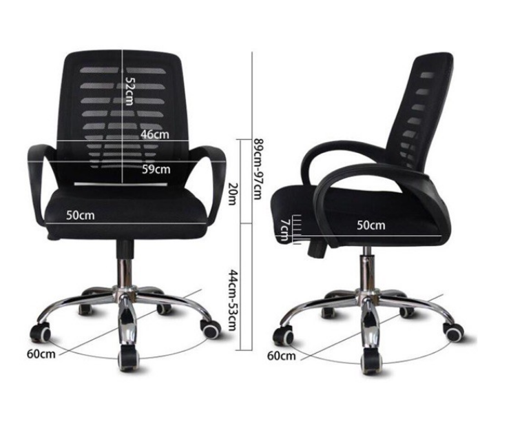 Kích thước: W49-58 x D47 x H92-104 cm (Cao tổng). H từ ngồi đến lưng: 48 cm, H Tay: 64-76 cm, H đất-ngồi: 48-60 cm (Lúc Ben thấp – Ben cao) Chất liệu: lưng rời,