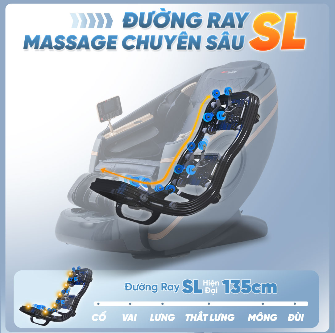 Các con lăn chạy dọc theo đường ray SL ôm trọn cơ thể từ cổ đến mông, chuyển động đa chiều và có khả năng điều chỉnh độ mạnh – nhẹ khác nhau tùy vào từng thể trạng người dùng. Nhờ đó, nó có thể tác động sâu vào các vùng đau mỏi, thực hiện động tác đấm, bóp,… giúp giảm nhanh các cơn đau mỏi.