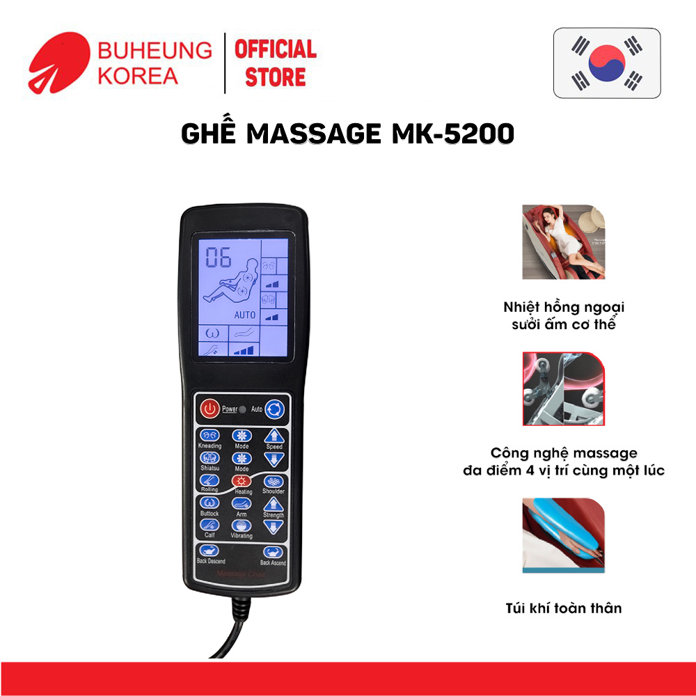 Ghế massage MK-5200 là một thiết bị không thể thiếu cho sức khỏe gia đìnhCấu tạo của ghế massage Buheung MK-5200 giúp massage toàn bộ cơ thể, từ đầu, vai, lưng, tay, chân, bàn chân, hông. Cho bạn một cảm giác massage trọn vẹn đồng thời mang lại hiệu quả cao hơn các dòng ghế massage trước đây.