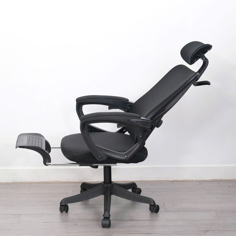 Ghế công thái học có gác chân hiện đại Chất liệu: Lưng lưới, nệm lưới, chân nhựa có bánh xe, có gác chân. Ghế xoay, nâng hạ, ngả nằm nghỉ trưa, tựa đầu điều chỉnh, lưng