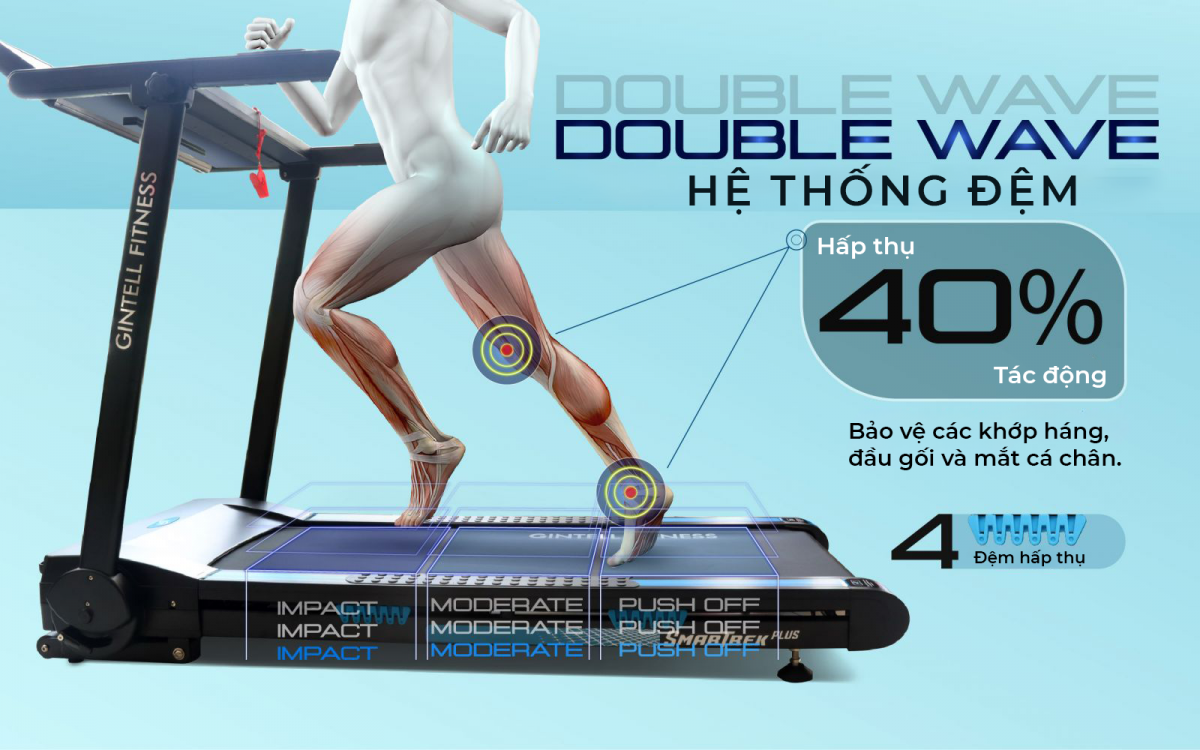 1. Công nghệ bảo vệ các khớp và đầu gối Với hệ thống DUBLE WAVE CUSHIONING và 4 miếng đệm đàn hồi hấp thụ lực lến đến 40%,  giảm thiểu tối đa tổn hại cho vùng hông, đầu gối và mắt cá chân, đồng thời hạn chế tối đa tiếng ồn, giúp bạn thoải mái chạy bộ ở nhà mà không sợ làm phiền tới người khác.