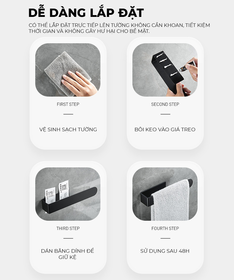 - Chất liệu: Thép sơn tĩnh điện - Màu sắc: 2 màu Đen và Trắng - Kich thước: 27cm - 40cm - Cách dùng: Dán tường bằng keo - Công năng: Treo khăn mặt, đồ dùng phòng tắm Quy trình lắp đặt: - Bước 1: Lau thật sạch và khô bề mặt dán - Bước 2: Bôi keo lên kệ (quý khách có thể tham khảo video sản phẩm) - Bước 3: Dán kệ lên tường và sau đó dán thêm miếng dán cố định để tránh trường hợp bị xê dịch hay rơi kệ -Bước 4: Giữ nguyên và chờ keo khô trong 72h. Quý khách lưu ý trong thời gian chờ keo khô chúng ta không để đồ lên kệ ạ. Sau 72h keo đã khô hoàn toàn và dính chắc rồi thì quý khách có thể bắt đầu sử dụng.