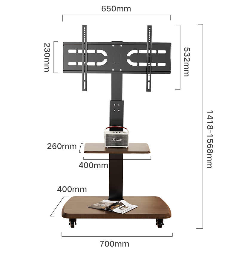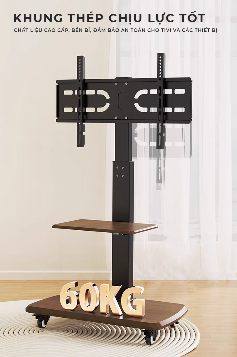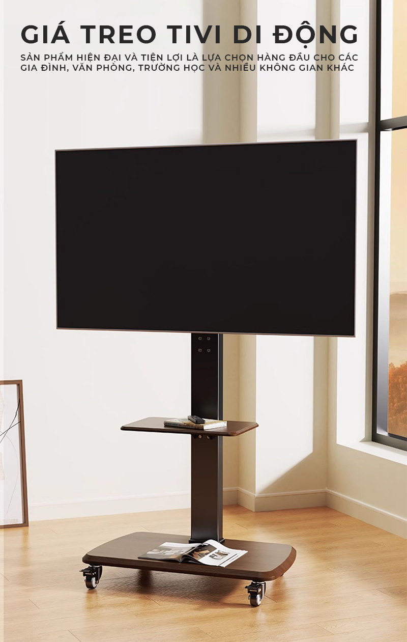 Công năng: Là mẫu giá treo tivi di động kèm kệ để đồ tiện lợi phù hợp nhiều không gian như phòng khách, phòng ngủ, phòng họp, phòng cộng đồng, ...