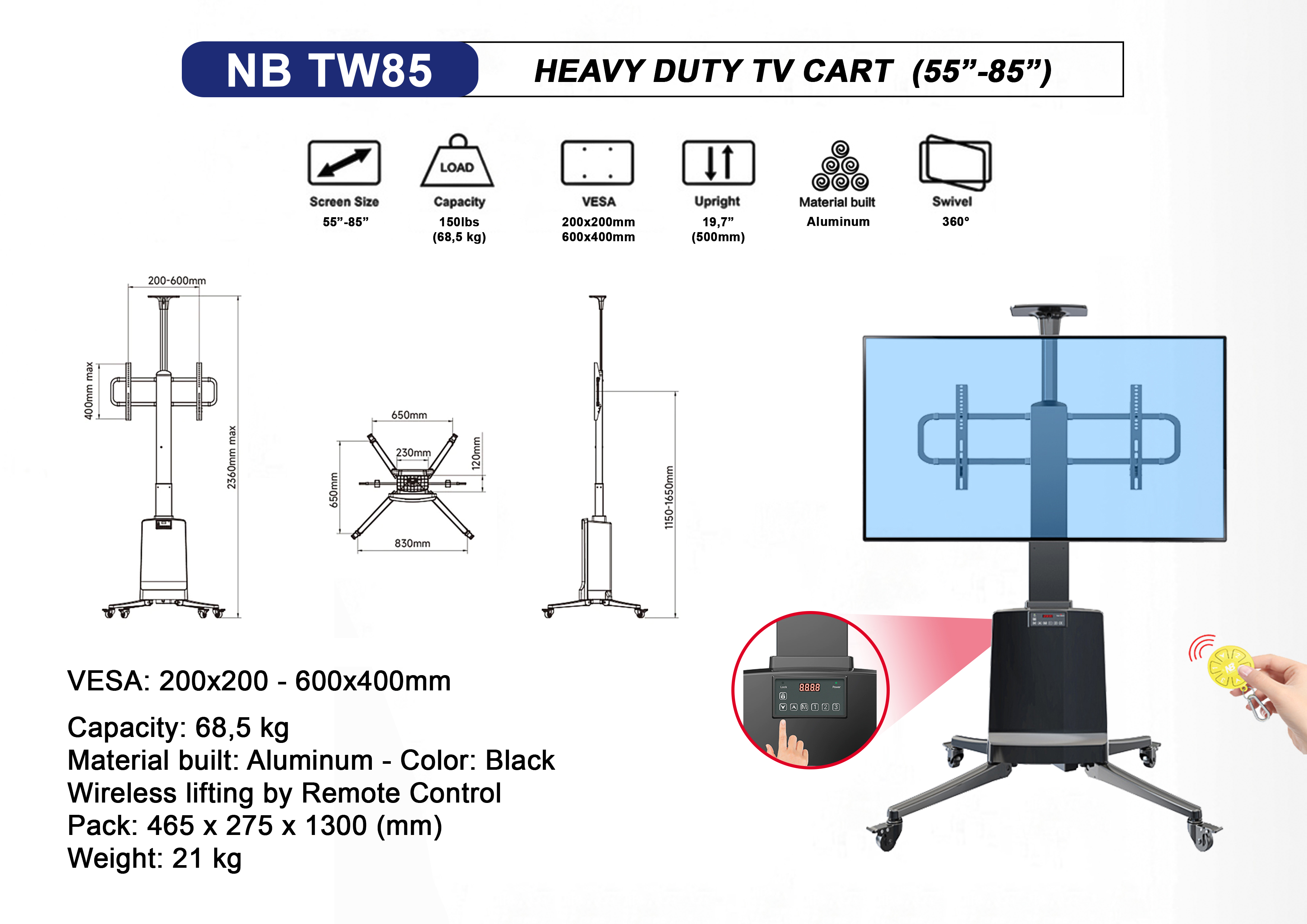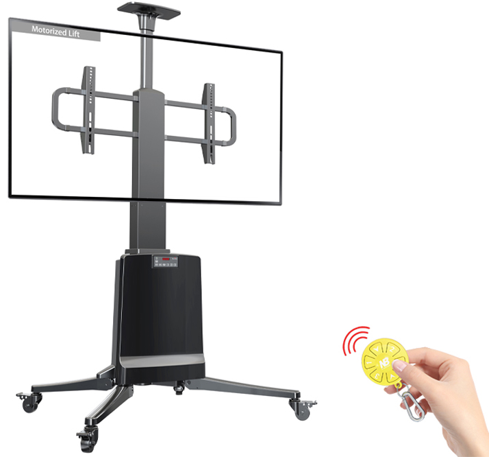 Được thiết kế rất tinh tế, tiện dụng và cơ động để có thể gắn tivi có trọng lượng tổng lên đến 68,2 kg, lắp được màn hình phẳng tử 55 inch đến 85 inch, với 4 bánh xe có chốt phanh đã được lắp đặt sẵn, nâng hạ không dây bằng Remote điện tử.
