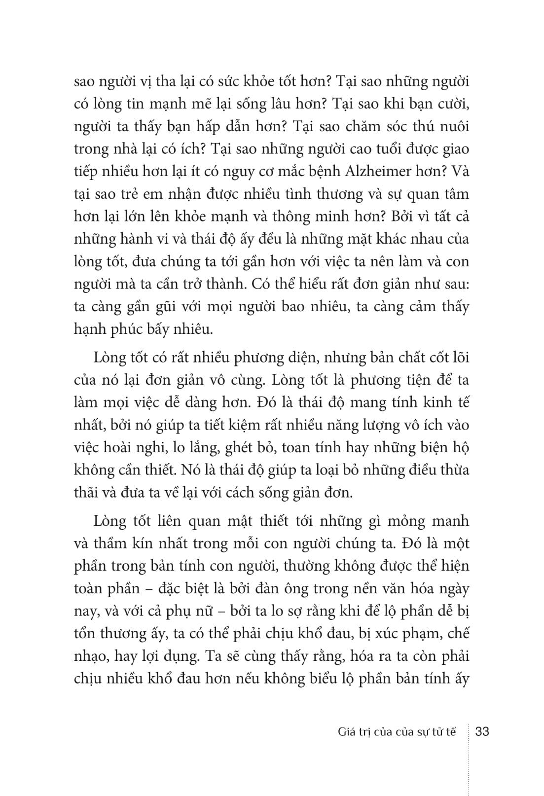 Quan tâm tới mọi người là một việc đáng làm, bởi vì hạnh phúc của chúng ta gắn liền với hạnh phúc của những người khác. Nếu xã hội chìm trong đau khổ, bản thân chúng ta cũng đau khổ. Khi trái tim và tâm trí ta càng bị cái ác lấn át, ta càng trở nên bất hạnh. Bởi vậy, lòng tốt và sự đồng cảm là những giá trị ta không thể thiếu được.