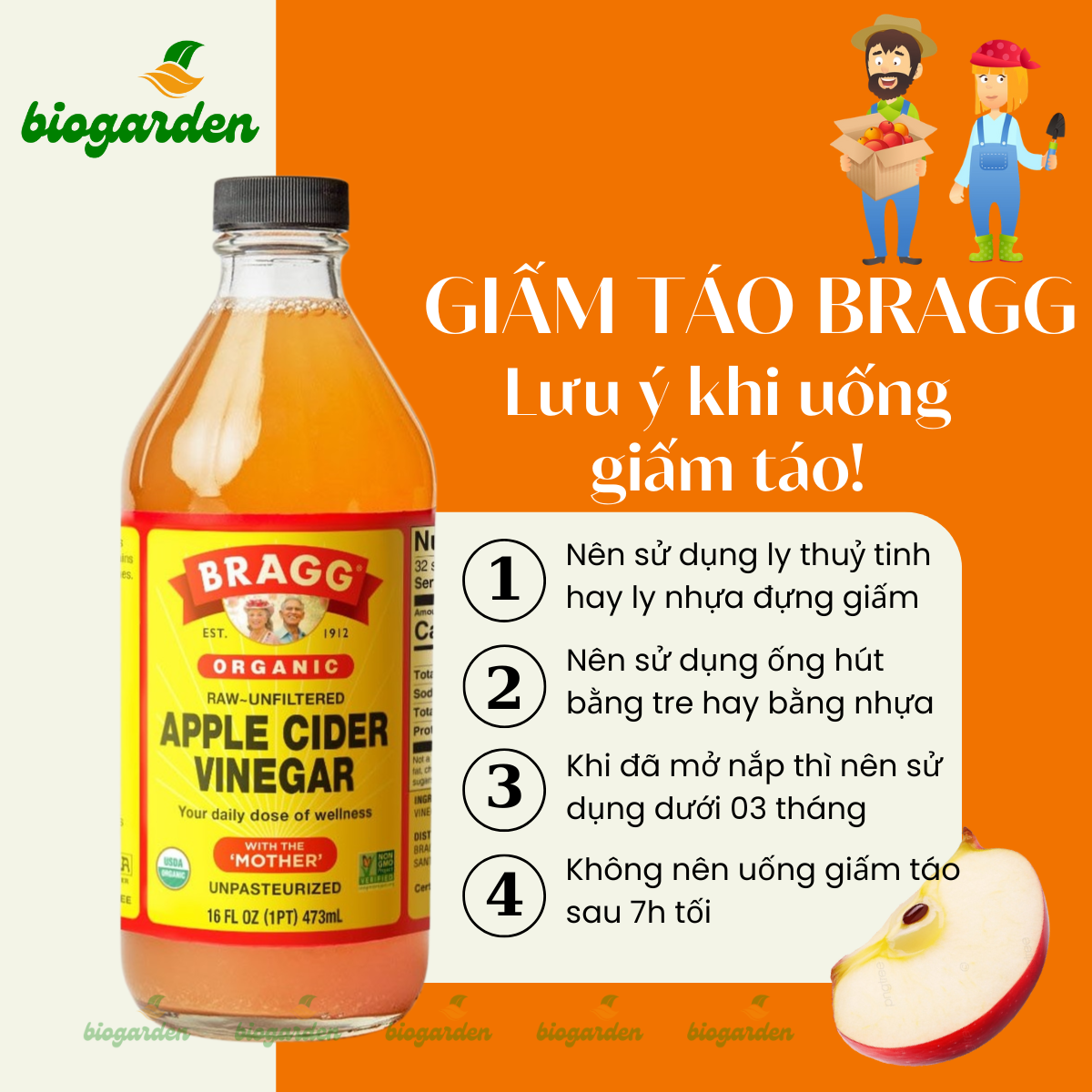 Mua tại TiktokCuối năm 2021, hãng Bragg đã thay đổi mẫu chai Giấm mới nên nhãn chai mới đã khác so với mẫu chai trước. Quý khách hãy tham khảo hình ảnh mẫu chai mới 2022 phía dưới của hãng Bragg cung cấp. Chứng nhận hữu cơ USDA Hàng chính hãng Bragg ️Xuất xứ: Bragg - Mỹ Apple cider vinegar organic Bragg Thành phần: Được làm từ táo hữu cơ và nước tinh khiết. Ưu điểm của sản phẩm: Sản phẩm được sản xuất bằng loại táo hữu cơ trồng tại Mỹ, loại bỏ được mối lo táo biến đổi gen hay ô nhiễm thuốc trừ sâu. Sản phẩm không lọc, không hấp khử trùng giúp bảo toàn các con giấm mẹ (Mother) trong giấm táo hữu cơ Bragg, các enzyme, axit amin cũng như các lợi khuẩn làm nên lợi ích tuyệt vời nhất của loại giấm này. Công dụng của giấm táo đối với sức khỏe