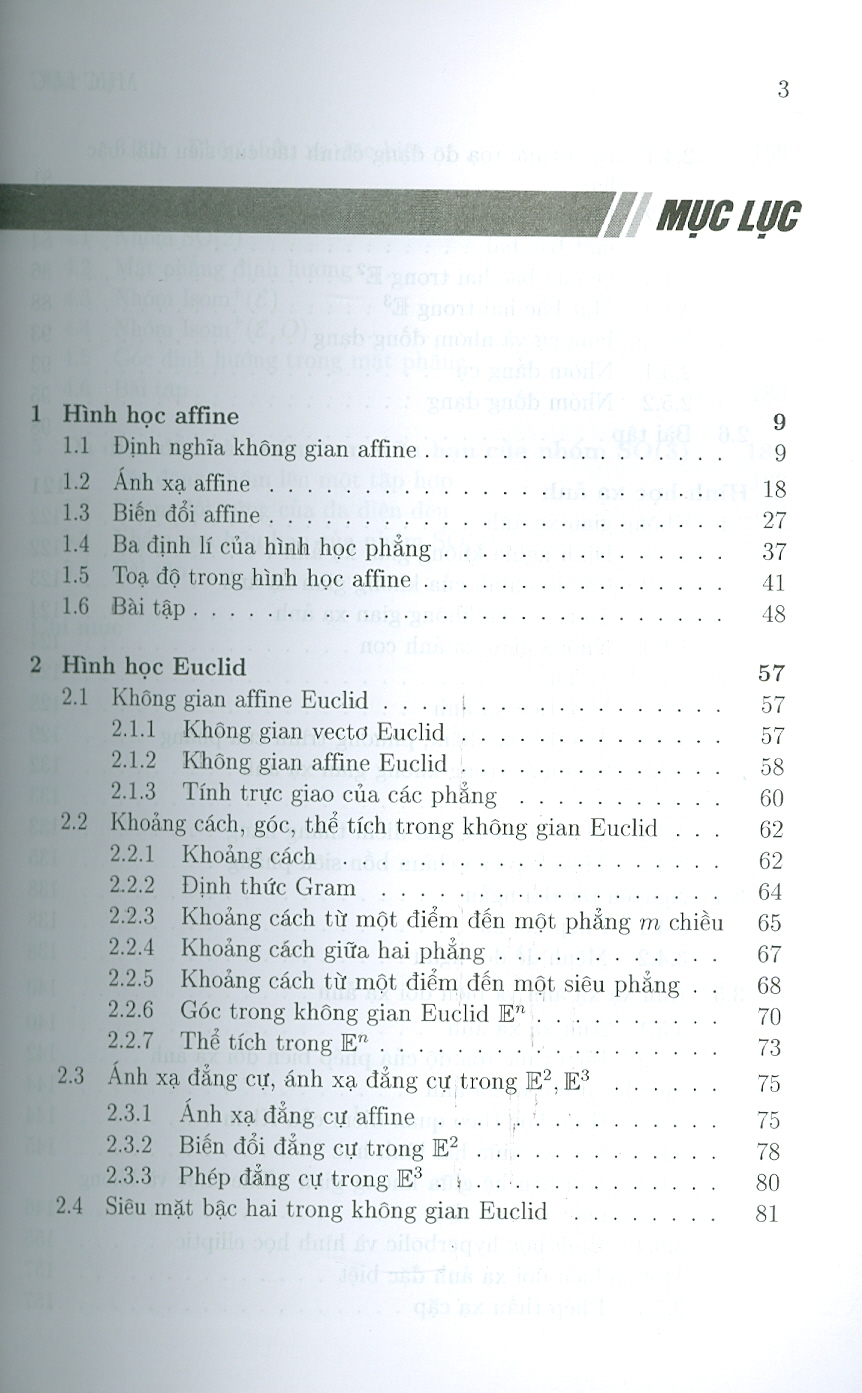 Giáo trình gồm 5 chương, trình bày những kiến thức cơ bản cốt lõi của Hình học affine, Hình học Euclid, Hình học xạ ảnh, Mặt phẳng định hướng, Đa diện đều và nhóm con hữu hạn của nhóm SO(3).