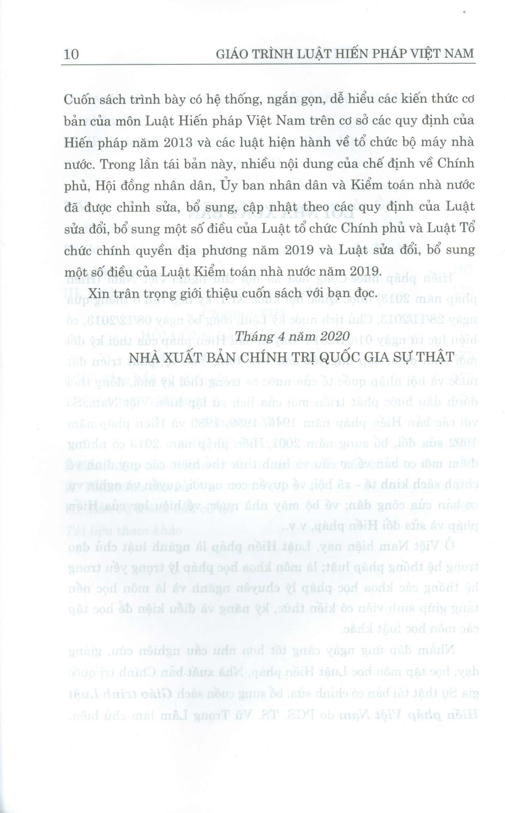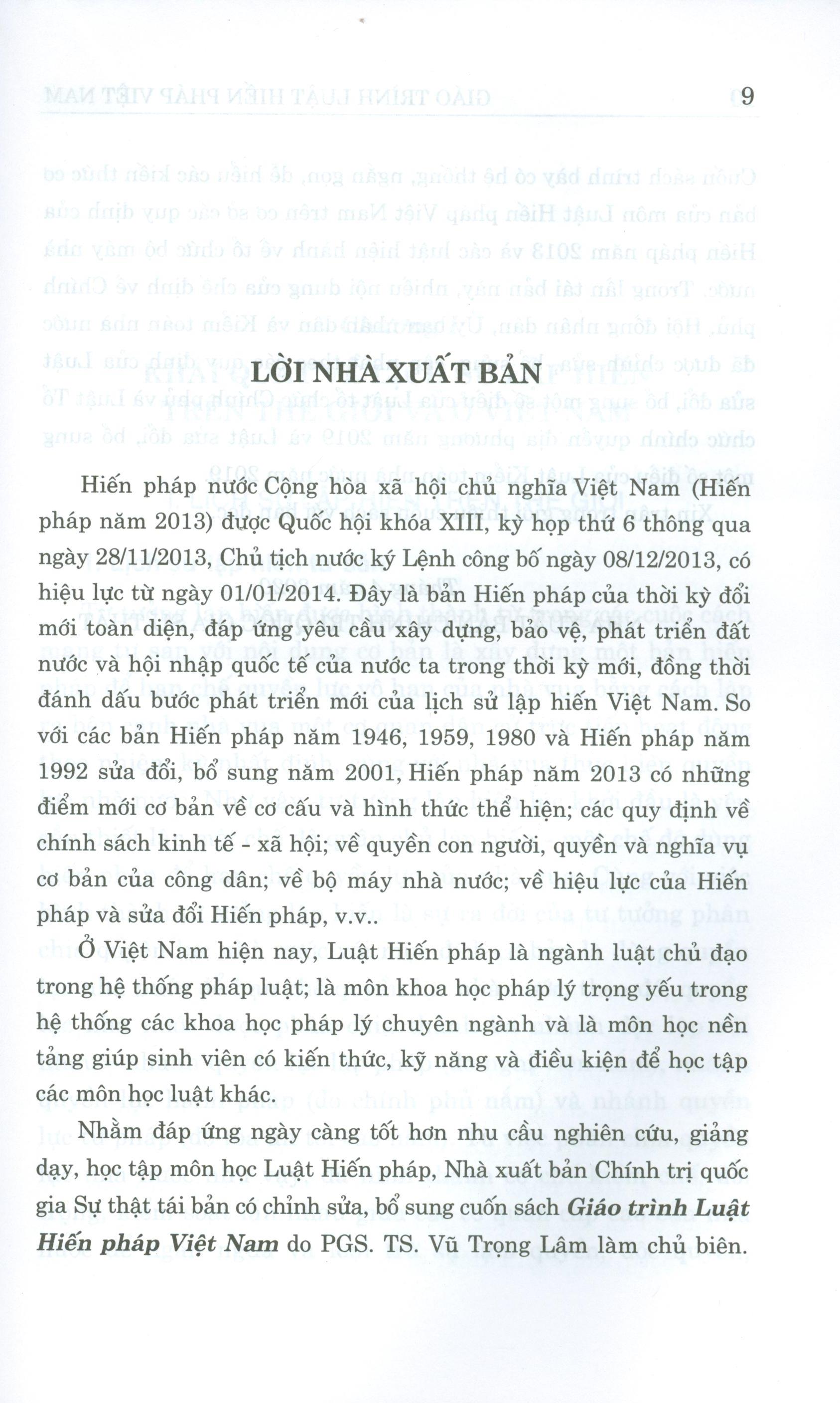 Hiến pháp nước Cộng hòa xã hội chủ nghĩa Việt Nam (Hiến pháp năm 2013) được Quốc hội khóa XIII, kỳ họp thứ 6 thông qua ngày 28/11/2013, Chủ tịch nước ký Lệnh công bố ngày 08/12/2013, có hiệu lực từ ngày 01/01/2014. Đây là bản Hiến pháp của thời kỳ đổi mới toàn diện, đáp ứng yêu cầu xây dựng, bảo vệ, phát triển đất nước và hội nhập quốc tế của nước ta trong thời kỳ mới, đồng thời đánh dấu bước phát triển mới của lịch sử lập hiến Việt Nam. So với các bản Hiến pháp năm 1946, 1959, 1980 và Hiến pháp năm 1992 sửa đổi, bổ sung năm 2001, Hiến pháp năm 2013 có những điểm mới cơ bản về cơ cấu và hình thức thể hiện; các quy định về chính sách kinh tế - xã hội; về quyền con người, quyền và nghĩa vụ cơ bản của công dân; về bộ máy nhà nước; về hiệu lực của Hiến pháp và sửa đổi Hiến pháp, V.V Ở Việt Nam hiện nay, Luật Hiến pháp là ngành luật chủ đạo trong hệ thống pháp luật; là môn khoa học pháp lý trọng yếu trong hệ thống các khoa học pháp lý chuyên ngành và là môn học nền tảng giúp sinh viên có kiến thức, kỹ năng và điều kiện để học tập các môn học luật khác. Nhằm đáp ứng ngày càng tốt hơn nhu cầu nghiên cứu, giảng dạy, học tập môn học Luật Hiến pháp, Nhà xuất bản Chính trị quốc gia Sự thật tái bản có chỉnh sửa, bổ sung cuốn sách Giáo trình Luật Hiến pháp Việt Nam do PGS. TS. Vũ Trọng Lâm làm chủ biên. Cuốn sách trình bày có hệ thống, ngắn gọn, dễ hiểu các kiến thức cơ bản của môn Luật Hiến pháp Việt Nam trên cơ sở các quy định của Hiến pháp năm 2013 và các luật hiện hành về tổ chức bộ máy nhà nước. Trong lần tái bản này, nhiều nội dung của chế định về Chính phủ, Hội đồng nhân dân, ủy ban nhân dân và Kiểm toán nhà nước đã được chỉnh sửa, bổ sung, cập nhật theo các quy định của Luật sửa đổi, bổ sung một số điều của Luật tổ chức Chính phủ và Luật Tổ chức chính quyền địa phương năm 2019 và Luật sửa đổi, bổ sung một số điều của Luật Kiểm toán nhà nước năm 2019.