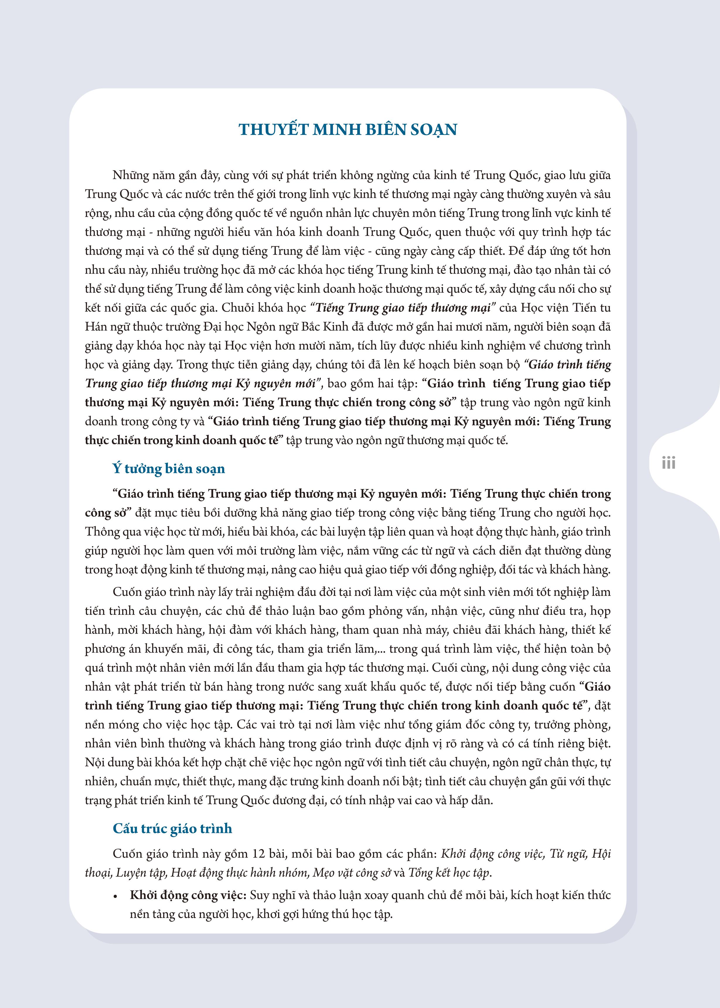 Những năm gần đây, cùng với sự phát triển không ngừng của kinh tế Trung Quốc, giao lưu giữa Trung Quốc và các nước trên thế giới trong lĩnh vực kinh tế thương mại ngày càng thường xuyên và sâu rộng, nhu cầu của cộng đồng quốc tế về nguồn nhân lực chuyên môn tiếng Trung trong lĩnh vực kinh tế thương mại - những người hiểu văn hóa kinh doanh Trung Quốc, quen thuộc với quy trình hợp tác thương mại và có thể sử dụng tiếng Trung để làm việc - cũng ngày càng cấp thiết. Để đáp ứng tốt hơn nhu cầu này, nhiều trường học đã mở các khóa học tiếng Trung kinh tế thương mại, đào tạo nhân tài có thể sử dụng tiếng Trung để làm công việc kinh doanh hoặc thương mại quốc tế, xây dựng cầu nối cho sự kết nối giữa các quốc gia. Chuỗi khóa học “Tiếng Trung giao tiếp thương mại” của Học viện Tiến tu Hán ngữ thuộc trường Đại học Ngôn ngữ Bắc Kinh đã được mở gần hai mươi năm, người biên soạn đã giảng dạy khóa học này tại Học viện hơn mười năm, tích lũy được nhiều kinh nghiệm về chương trình học và giảng dạy. Trong thực tiễn giảng dạy, chúng tôi đã lên kế hoạch biên soạn bộ “Giáo trình tiếng Trung giao tiếp thương mại Kỷ nguyên mới”, bao gồm hai tập: “Giáo trình tiếng Trung giao tiếp thương mại Kỷ nguyên mới: Tiếng Trung thực chiến trong công sở” tập trung vào ngôn ngữ kinh doanh trong công ty và “Giáo trình tiếng Trung giao tiếp thương mại Kỷ nguyên mới: Tiếng Trung thực chiến trong kinh doanh quốc tế” tập trung vào ngôn ngữ thương mại quốc tế.