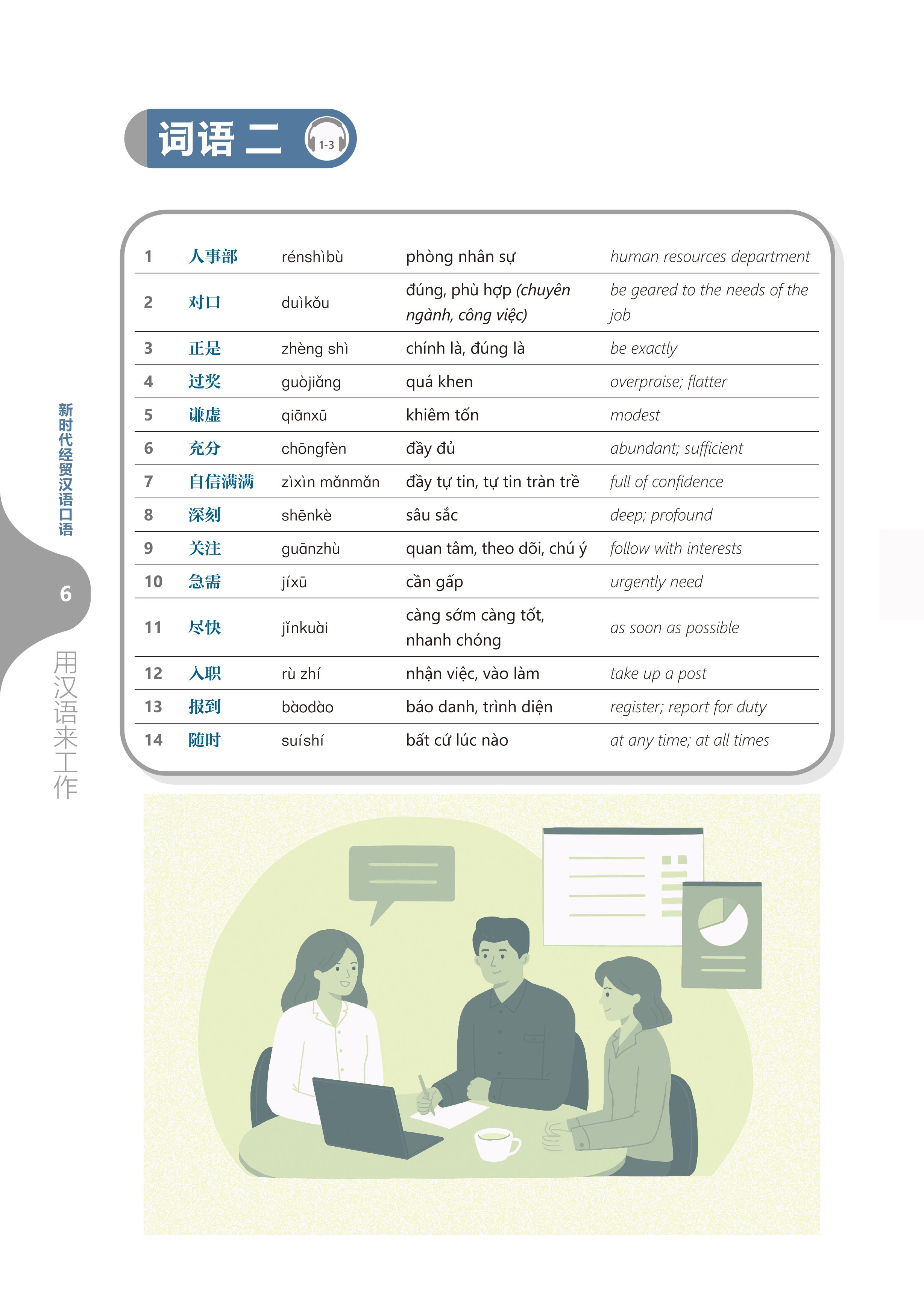• Từ ngữ và Hội thoại: Nội dung cốt lõi của mỗi bài. Mỗi bài học hai đoạn hội thoại liên quan đến chủ đề bài học, thúc đẩy tình tiết câu chuyện phát triển, đồng thời nắm vững các từ ngữ trọng điểm liên quan, đặc biệt là các từ ngữ thường dùng trong môi trường kinh doanh.