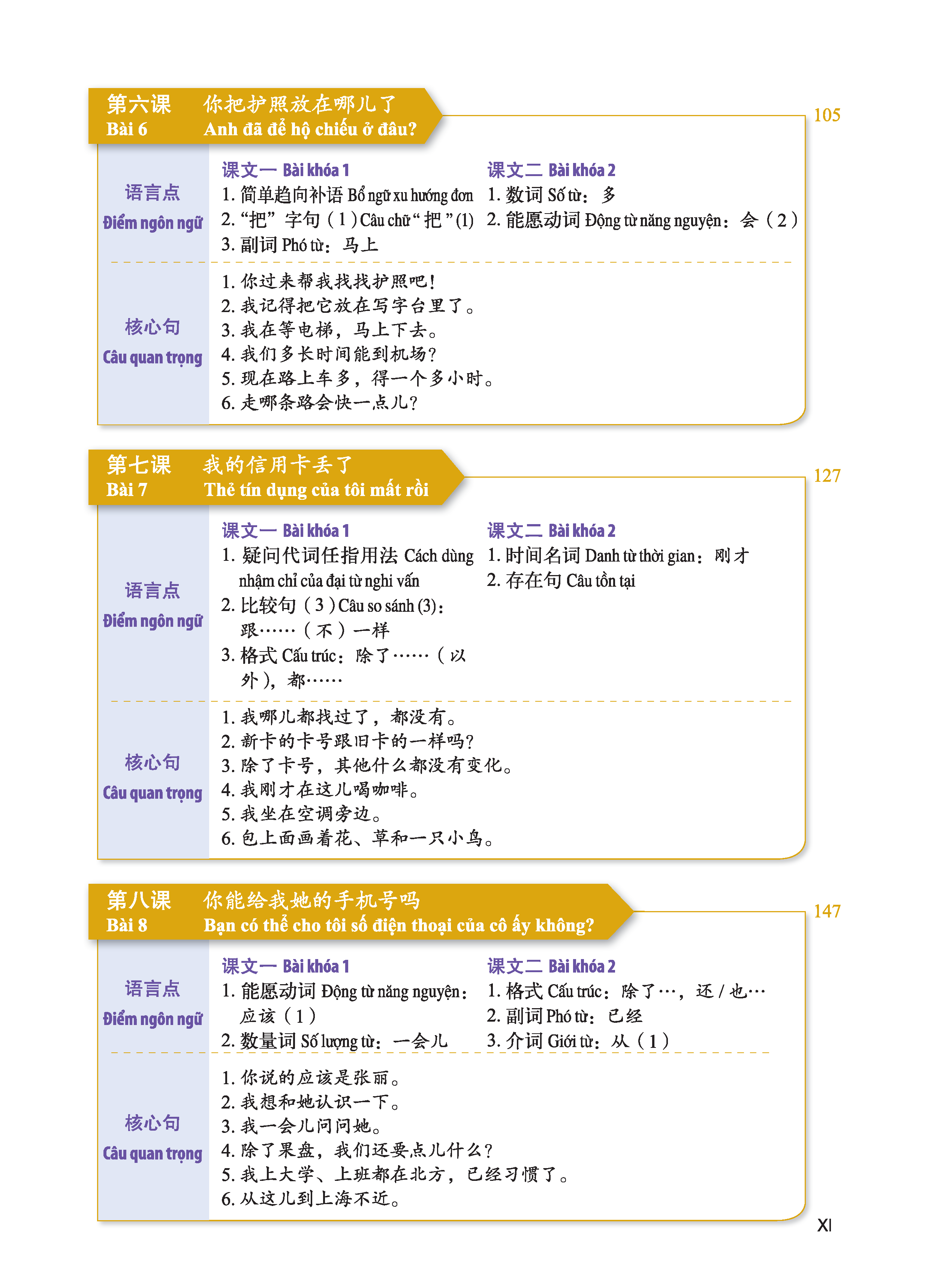 Bộ giáo trình này bao gồm 6 quyển Sách Bài học tổng hợp, 6 quyển Sách Bài tập tổng hợp. Bài học và Bài tập phối hợp với nhau, mỗi quyển 16 bài. Giáo trình tuân thủ nghiêm ngặt yêu cầu của “Đề cương thi HSK” và đề cương “Kỳ thi tốt nghiệp giáo dục dự bị đại học dành cho lưu học sinh chính quy du học tại Trung Quốc do chính phủ Trung Quốc cấp học bổng”, sắp xếp cụ thể như sau: