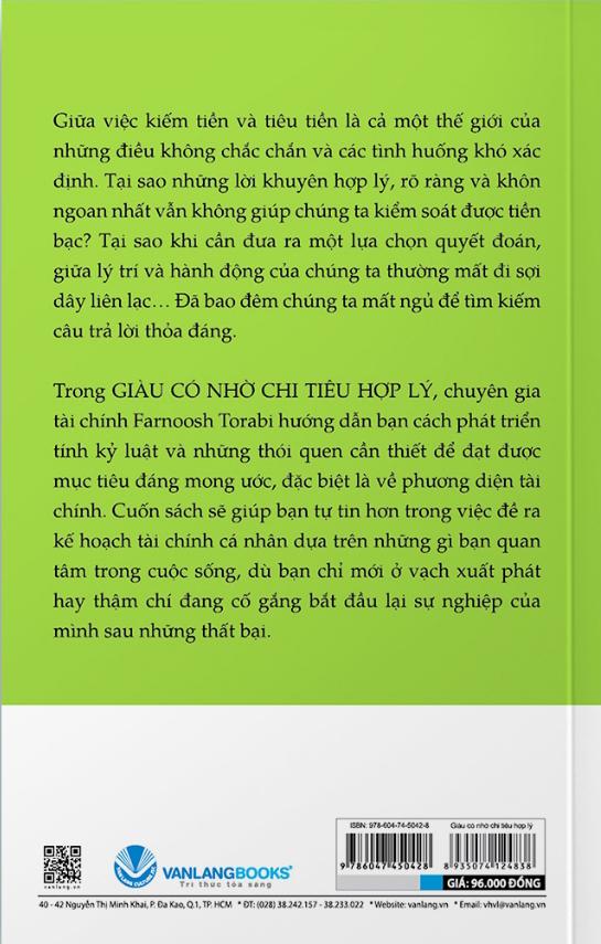 Trong Giàu có nhờ chi tiêu hợp lý, chuyên gia tài chính Farnoosh Torabi hướng dẫn bạn cách phát triển tính kỷ luật và những thói quen cần thiết để đạt được mục tiêu đáng mong ước, đặc biệt là về phương diện tài chính. Cuốn sách sẽ giúp bạn tự tin hơn trong việc đề ra kế hoạch tài chính cá nhân dựa trên những gì bạn quan tâm trong cuộc sống, dù bạn chỉ mới ở vạch xuất phát hay thậm chí đang cố gắng bắt đầu lại sự nghiệp của mình sau những thất bại.