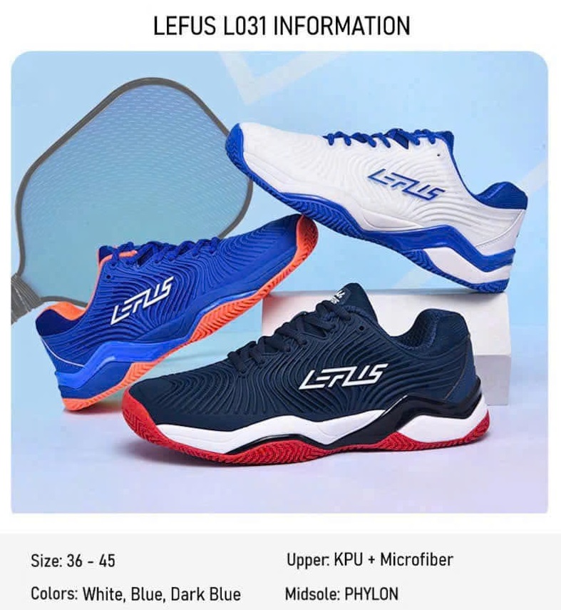 Thông tin chi tiết giày Pickleball Lefus L031 • Màu sắc: Đen Đỏ/ Xanh Cam/ Trắng Xanh • Thân giày/ Upper: Da PU, vải Mesh. • Đế giữa/ Midsole: EVA đàn hồi cao, TPU chống