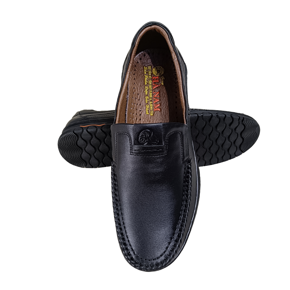 Tên sản phẩm: Giày Lười Nam Trường Hải Đế Âm da bò nguyên tấm 2 màu đen, vàng GL330 Quai giày :được gia công tại nhà nên được làm bằng da bò cao cấp càng