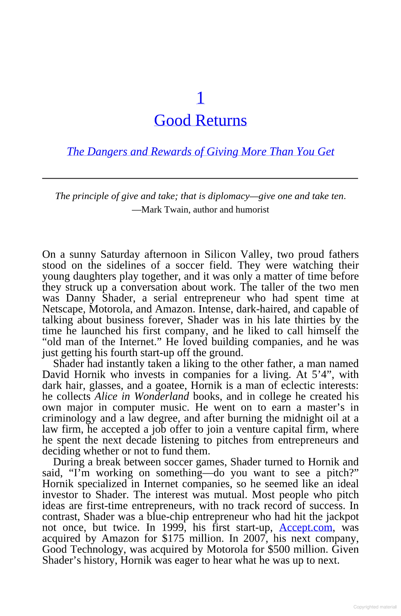 GIVE AND TAKE presents the fascinating secrets to givers' success. The results are unequivocal: givers gain big. Jack Welch, Richard Branson, Jon Huntsman Sr. - all of them are givers. In a world in which so many takers such as Bernard Madoff and Raj Rajaratnam have ruined lives and reputations, this book will reassure readers that the real power lies in becoming a giver. Since the vast majority of people aren't born givers, Grant not only presents the case for why givers win, he also offers their hidden strategies for winning.