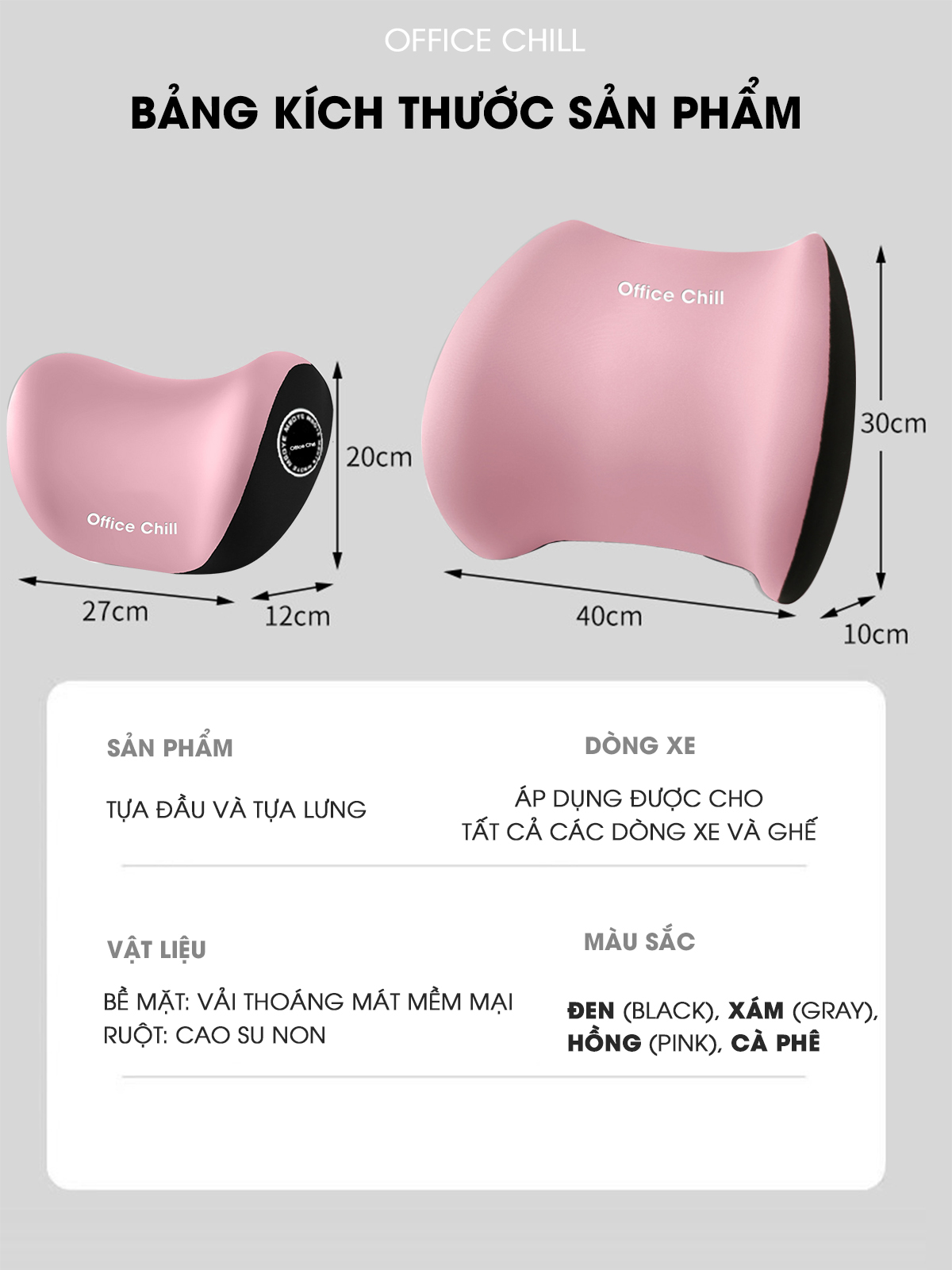Gối Tựa Đầu, Gối Tựa Lưng chất liệu vải bên ngoài mềm mại thoáng mát, ruột cao su non đặc tính đàn hồi và khả năng giữ form vượt trội.