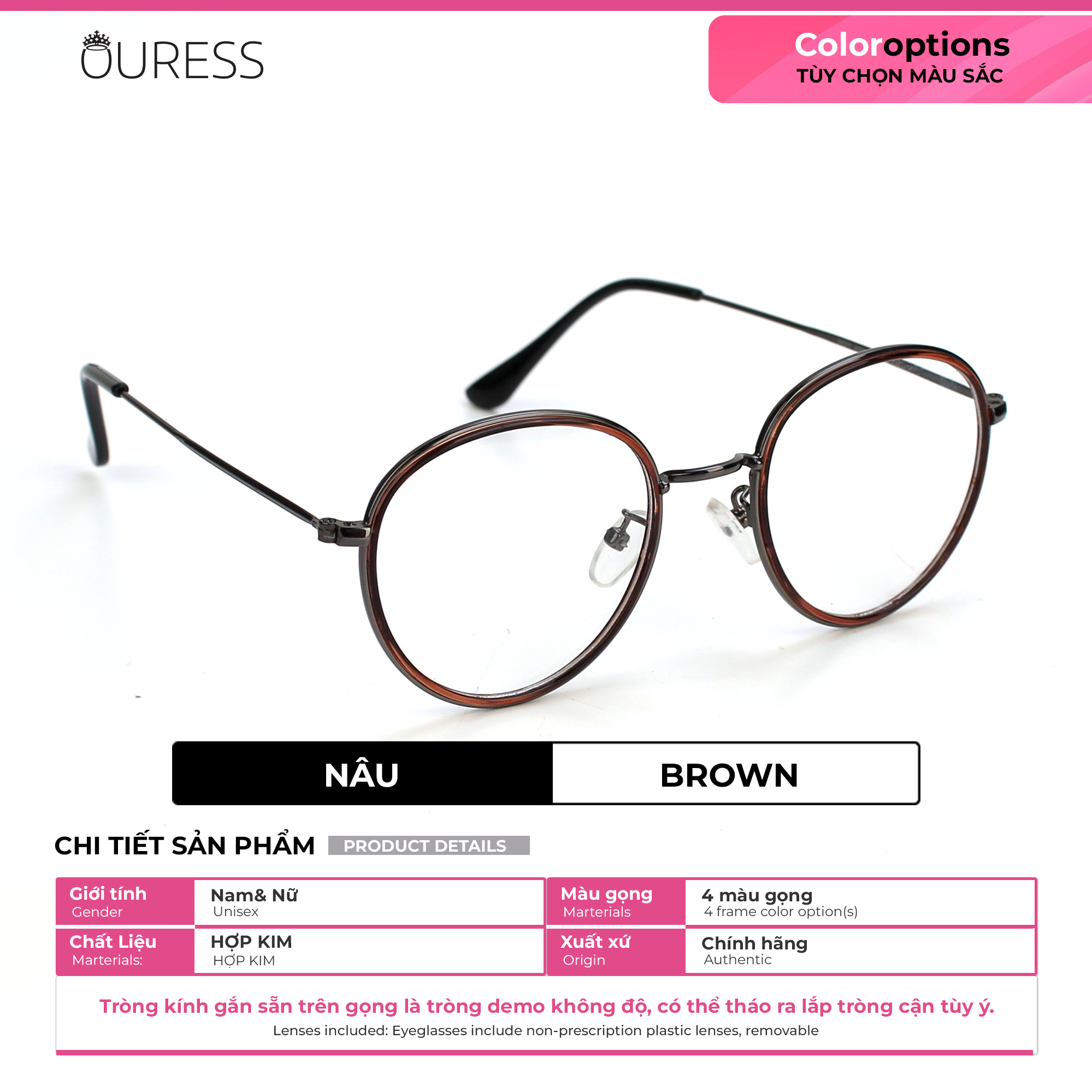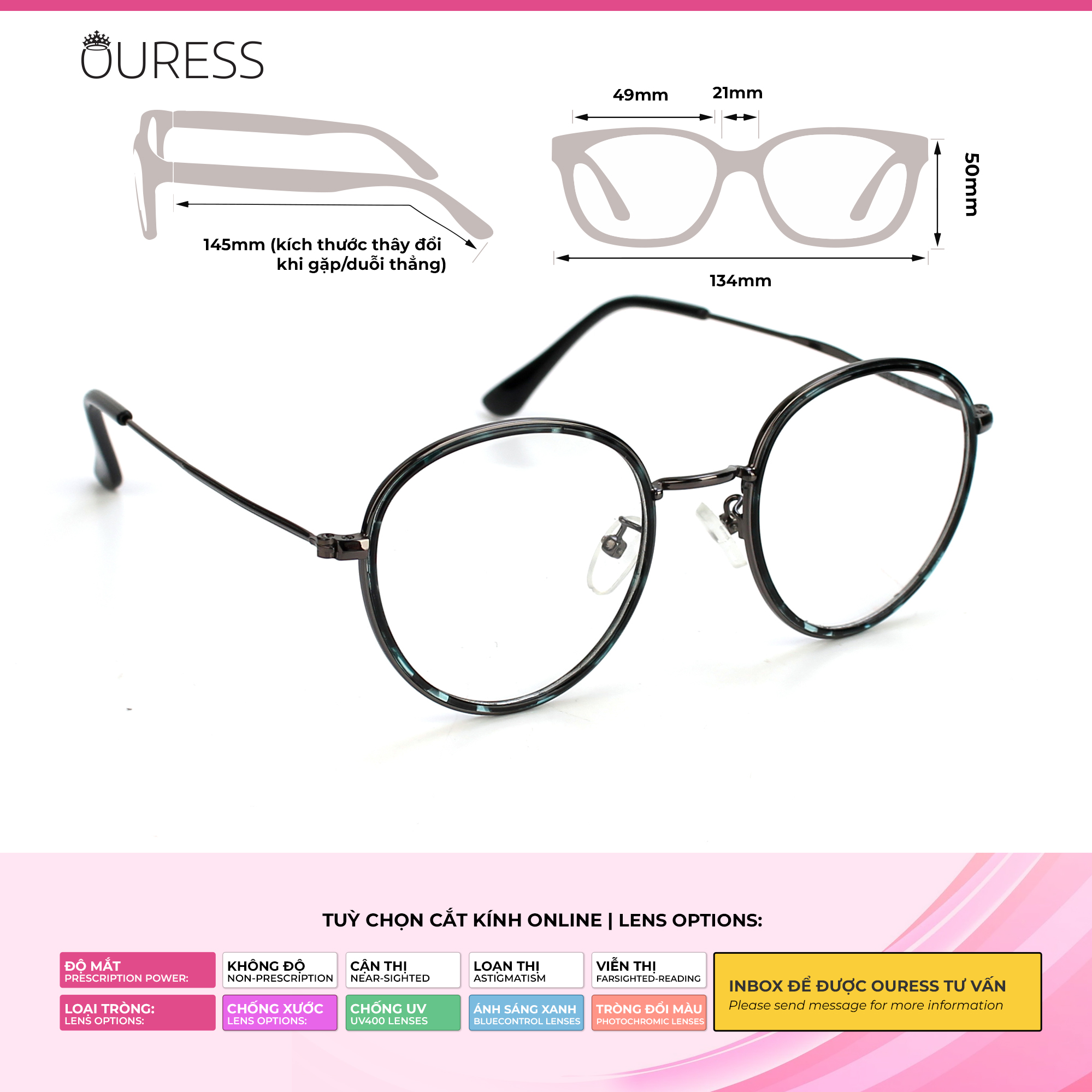 - Ouress nhận cắt tất cả các loại khúc xạ (cận, viễn, loạn, lão và kể cả độ cận cao) Lưu ý: Quý khách vui lòng cung cấp đầy đủ thông tin như trên cho Ouress trong vòng 02 ngày kể từ ngày đặt hàng. Hết thời hạn mà không nhận được thông tin, Ouress xin phép được gửi mặc định tròng 0 độ để đảm bảo quy định giao hàng của sàn. —-------------------------------------- KHUYẾN CÁO BẢO QUẢN GỌNG KÍNH VÀ TRÒNG KÍNH: Nên đeo và tháo kính bằng 2 tay Bỏ vào hộp đựng kính khi không dùng đến , Lau sạch tròng kính bằng khăn chuyên dụng để bảo vệ bề mặt tròng kính được tốt hơn Nên bỏ kính vào hộp đựng chuyên dụng khi chưa dùng đến để bảo vệ kính tốt hơn- Không để tròng kính úp ngược xuống dưới dễ trầy xước tròng kính —--------------------------------------