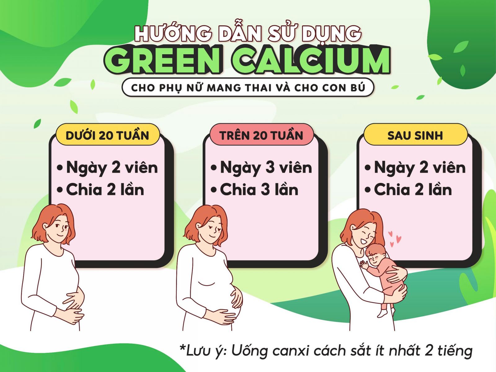 - Đảm bảo bé nhận đủ canxi qua thông qua sữa mẹ và bù lại canxi thiếu hụt trong thai kỳ Green Calcium còn là canxi hữu cơ mát rất cần thiết với phụ nữ sau sinh, đặc biệt là với mẹ cho con bú. 6.1. Đảm bảo bé nhận đủ canxi thông qua sữa mẹ Giai đoạn cho con bú, bé vẫn lấy canxi từ mẹ thông qua sữa mẹ, thậm chí còn lấy nhiều hơn khi mang bầu. Bởi trẻ dưới 6 tháng tuổi chưa được ăn dặm, đồng nghĩa sữa mẹ là nguồn duy nhất cung cấp canxi cho bé. Bên cạnh đó, nhu cầu canxi của bé sẽ tăng dần khi bé ngày càng lớn. Nếu mẹ bị thiếu canxi hoặc hàm lượng canxi cung cấp không đủ cho nhu cầu của mẹ và bé thì cả hai mẹ con đều bị thiếu canxi. Điều này vừa ảnh hưởng rất lớn đến sự phát triển của con sau này, vừa khiến mẹ dễ bị đau lưng, đau mỏi xương khớp và có nguy cơ loãng xương cao. Green Calcium là canxi hữu cơ mát được chiết xuất từ rau củ quả. Do đó, giúp cơ thể mẹ sau sinh dễ hấp thụ và nâng cao chất lượng sữa, phù hợp với hệ tiêu hóa non nớt của bé. 6.2. Bù lại canxi thiếu hụt trong thai kỳ Thời gian mang thai, lượng canxi mẹ tiêu thụ hầu hết đã chuyển cho bé. Vì thế, sau sinh, nhu cầu canxi của mẹ còn cao hơn lúc mang bầu. Bởi mẹ vừa phải bù lại lượng canxi bé lấy khi mang thai vừa phải cung cấp cho bé thông qua sữa mẹ. Ngoài ra, theo nhiều nghiên cứu, trong suốt thời gian nuôi con bằng sữa mẹ, phụ nữ sẽ mất khoảng 3 - 5% khối lượng xương. Nếu không bổ sung canxi sẽ khiến sức khỏe xương khớp của mẹ sau sinh suy yếu. Green Calcium với hàm lượng canxi cao 1000mg/ 2 viên, cùng tổ hợp công thức độc đáo bao gồm "Canxi + vitamin D3 +vitamin K2 + Vitamin C + Magie". Do đó, vừa bổ sung hàm lượng lớn canxi, vừa giúp cơ thể mẹ tối ưu sự hấp thụ, nhanh chóng bù lại lượng canxi bị thiếu hụt trong thai kỳ.