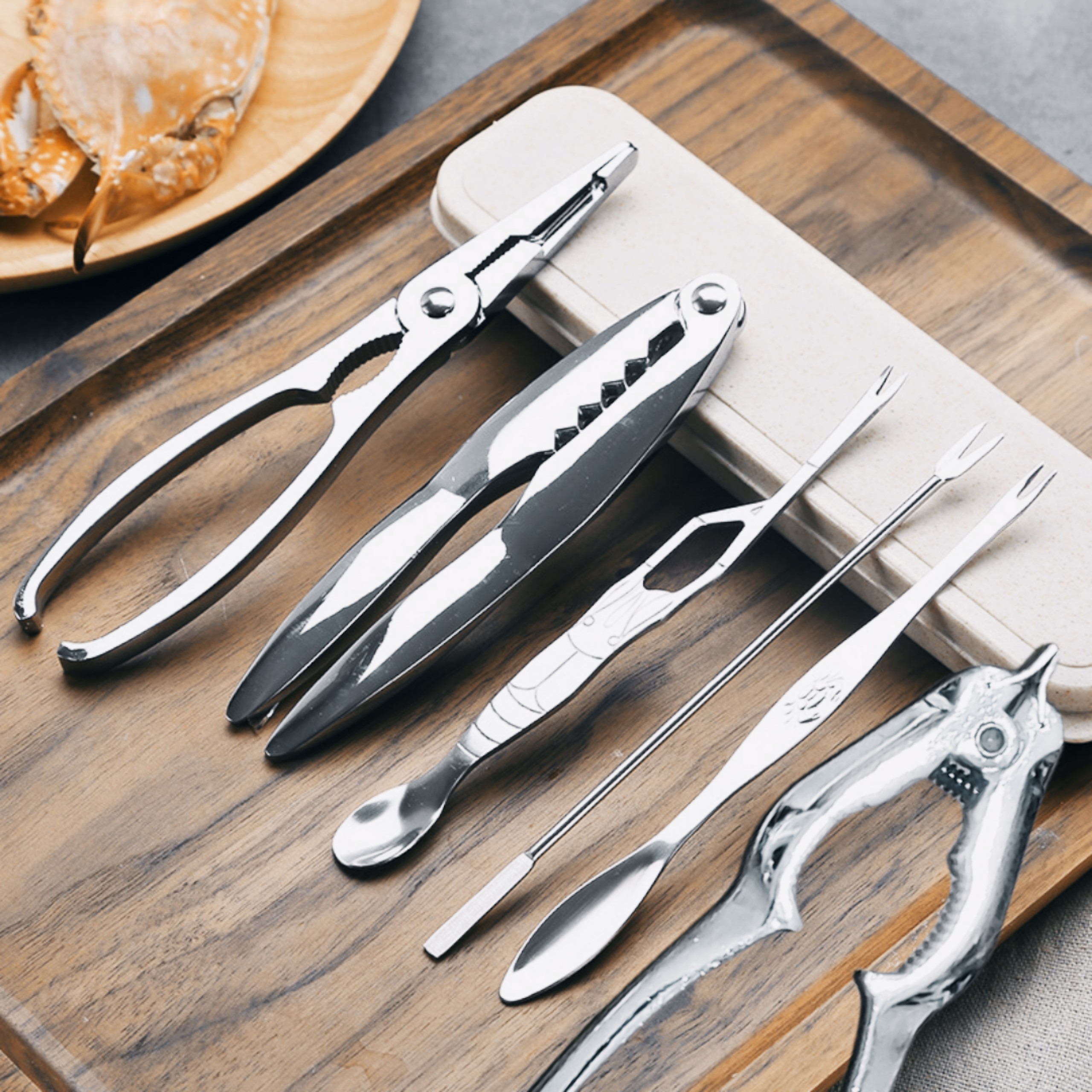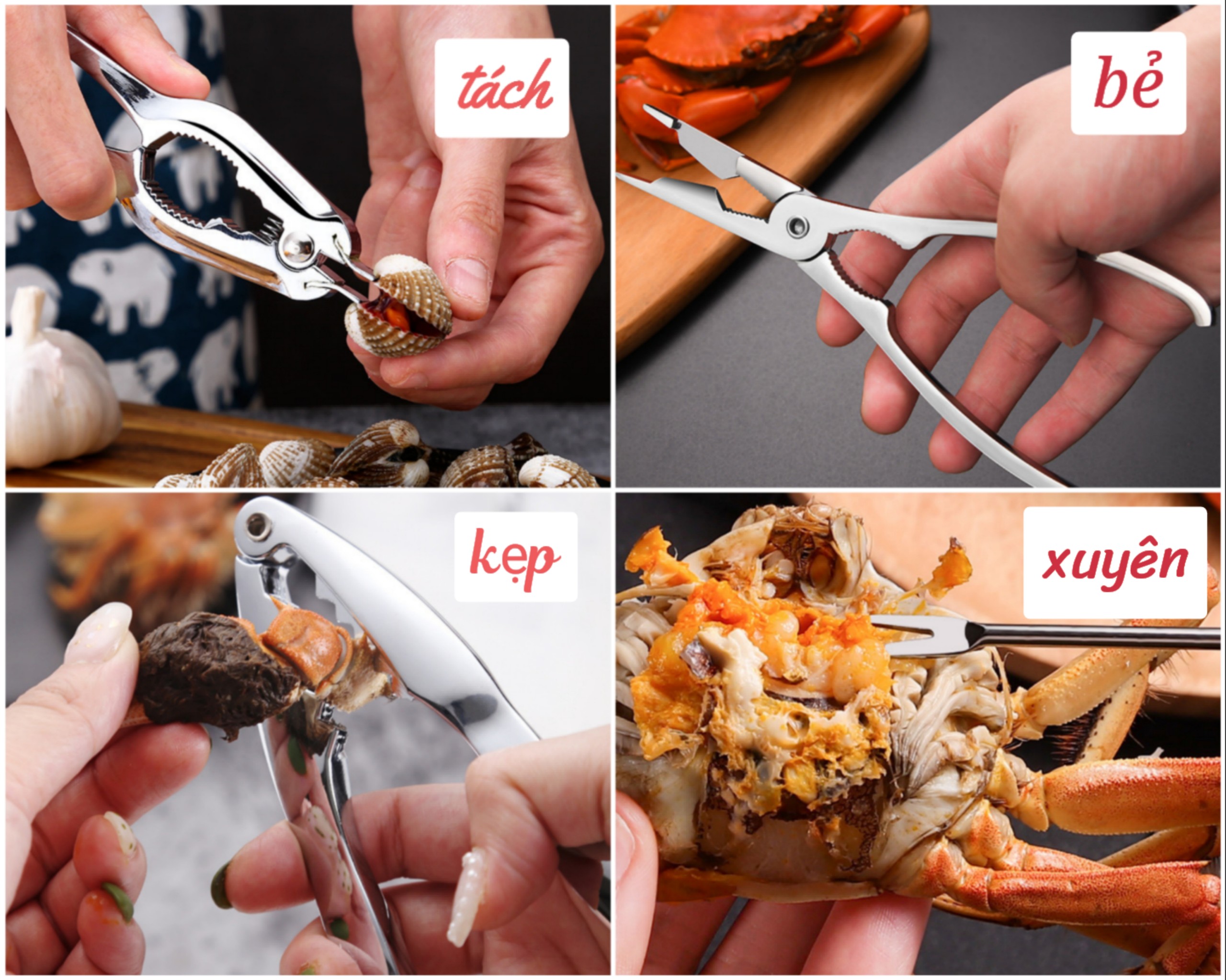 Bộ dụng cụ ăn hải sản bằng thép không gỉ.3 loại kìm kẹp đa năng và 3 nĩa ăn cua ghẹ thật dễ dàng...