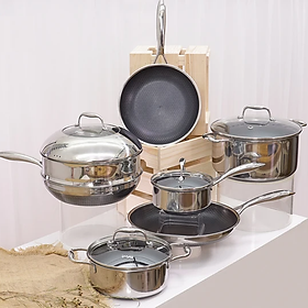 BỘ NỒI GỒM 6 MÓN: Nồi sâu cán dài 16c, nồi 22cm, nồi 26cm, chảo chiên 24cm, chảo chiên 30cm, chảo sâu lòng 28cm, kèm xửng28cm