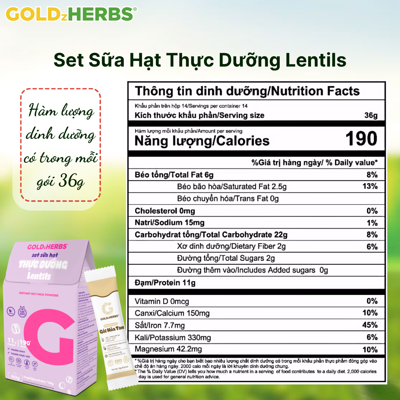 - Có thể thêm 1 gói bột sữa hạt GoldzHerbs xay cùng ly sinh tố yêu thích, hoặc pha sữa hạt ăn cùng granola. TRAVEL SIZE Dinh dưỡng lành mạnh trong gói nhỏ tiện dụng:
