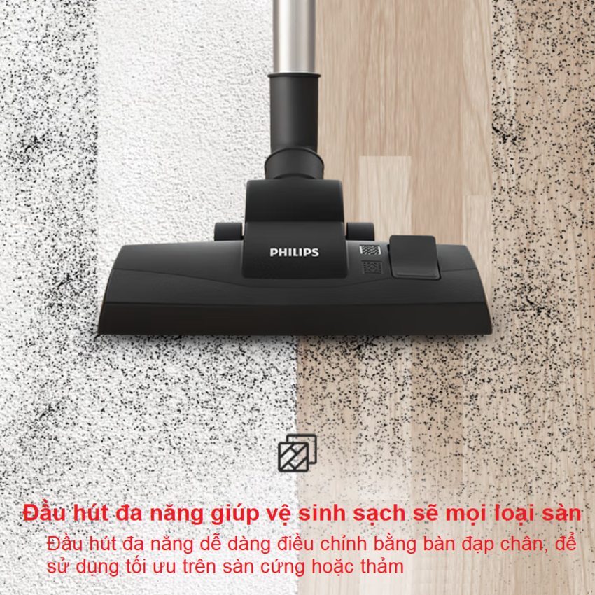 - Đầu hút đa năng có thể dễ dàng điều chỉnh bằng bàn đạp chân, để sử dụng tối ưu trên sàn cứng hoặc thảm. Ngăn chứa bụi được thiết kế để đổ sạch bụi hợp vệ sinh bằng một tay
