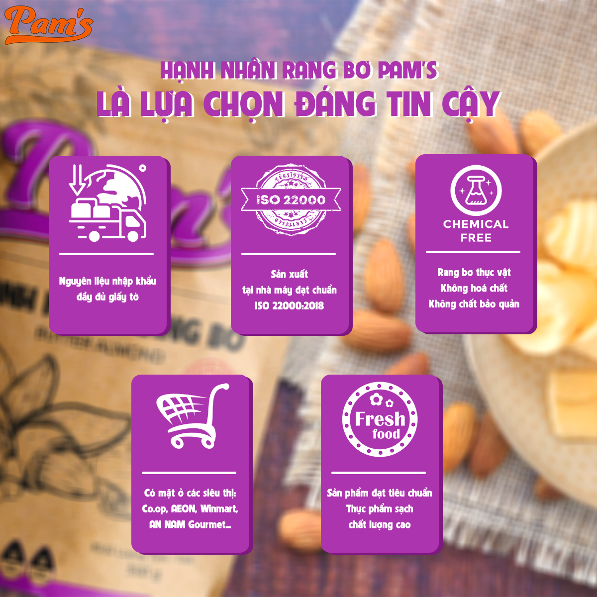 - Hạnh nhân Pams được lấy từ các vườn trồng của Mỹ, sau đó được sấy và đóng gói tại nhà máy hiện đại đạt chuẩn ISO 22000:2018 Việt Nam. MÔ TẢ: