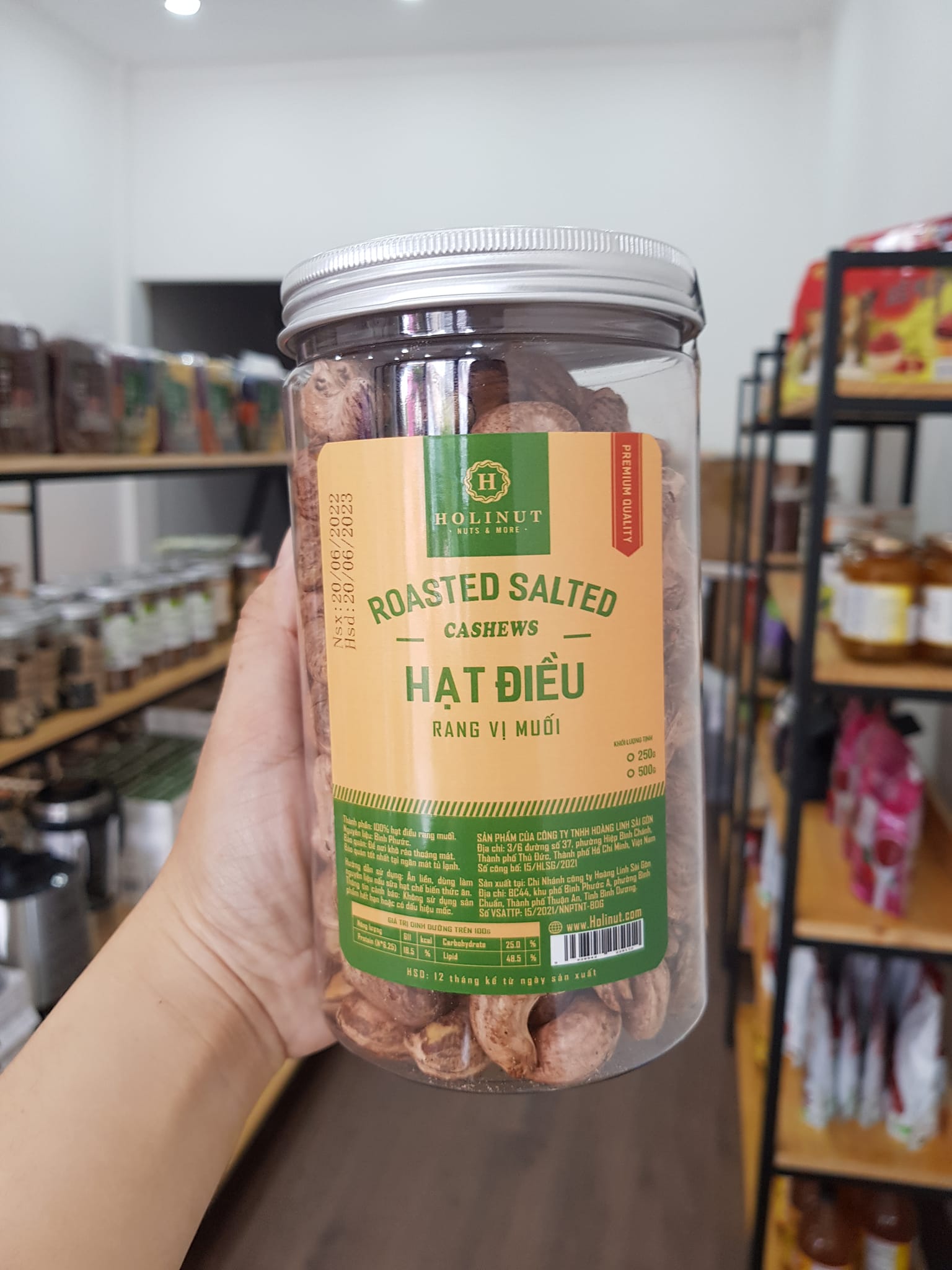 - HSD: 12 tháng kể từ ngày sản xuất Hạt điều rang muối nguyên hạt Bình Phước tốt cho người lớn, bà bầu và bé. Hạt điều rang muối được làm từ nguồn nguyên liệu hạt điều Bình Phước sạch, chọn lọc, hạt vụ mới tươi ngon. Hạt điều rang muối được rang củi thủ công với muối (muối chỉ chiếm tỉ lệ 1% nên không bị mặn đắng). Kỹ thuật rang theo công nghệ cao cho ra hạt chất lượng, đạt độ ẩm tiêu chuẩn giữ được vị hạt thơm ngon. Sau đó được xử lý bảo quản lạnh kỹ lưỡng trong môi trường chân không, chống nấm mốc.