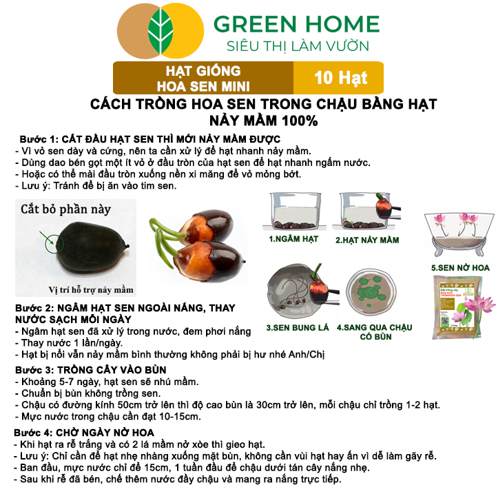 ✨Hạt Giống Hoa Sen Mini GreenHome, Gói 10 Hạt, Nhiều Màu, Dễ Trồng, Dễ Chăm, Nảy Mầm Tốt H01
