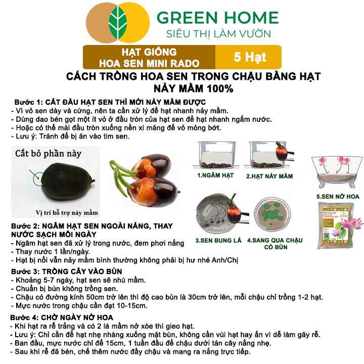 ✨Hạt Giống Hoa Sen Mini Rado GreenHome, Gói 5 Hạt, Nhiều Màu, Dễ Trồng, Dễ Chăm, Nảy Mầm Tốt H21