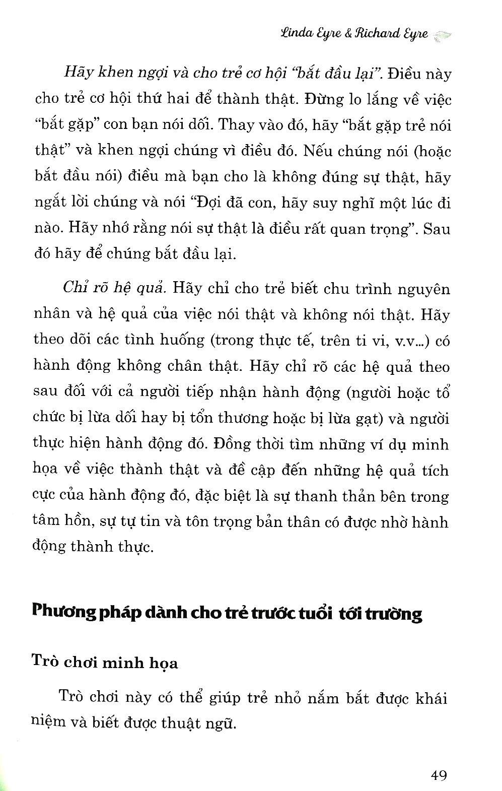 Một hôm, hai cậu con trai của chúng tôi, một lên 6 và một lên 9, đã tranh nhau một chiếc ghế. Cứ như thể đó là một mục tiêu không gì lay chuyển và một việc không thể cưỡng lại được. Đứa nào cũng khăng khăng rằng chiếc ghế cuối cùng đó đúng là chỗ của nó và nó là người đến trước. Khi cuộc đấu trí chuyển thành cuộc chiến la hét, khóc lóc và sắp chuyển thành một cuộc ẩu đả, tôi đã cân nhắc hai khả năng: (a) dành một chút thời gian để tìm hiểu xem ai đúng; hoặc (b) cho cả hai đứa ra “ghế ăn năn” ngồi cho đến khi mỗi đứa có thể xác định được mình đã làm sai việc gì. Nhưng trong trường hợp này, tôi nghĩ là không khả năng nào phát huy tác dụng. Vì thế, tôi đã nói: “Mẹ sẽ quan sát hai con, và xem ai sẽ cư xử đúng đắn. Mẹ nghĩ cả hai con đều biết việc đúng đắn cần làm để giải quyết vấn đề này”. Sau khoảng 15 giây im lặng, vẻ mặt của đứa mà tôi cá là sẽ buông tay khỏi nửa chiếc ghế toát lên vẻ hối lỗi. Sau khi thấy đứa không ích kỉ được khen ngợi hết lời, đứa còn lại cũng đưa chiếc ghế về phía đứa kia. --- Linda