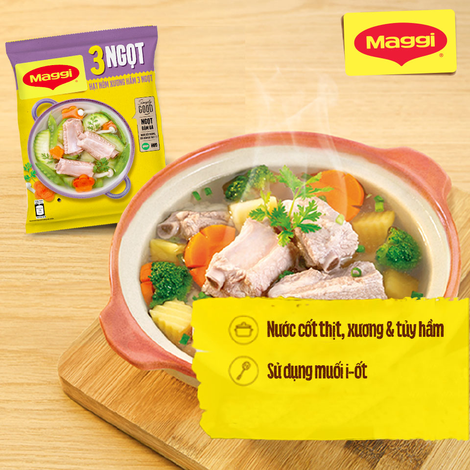 - Hạt nêm Maggi 3 ngọt heo với chiết xuất từ nước cốt thịt, xương và tủy hầm.