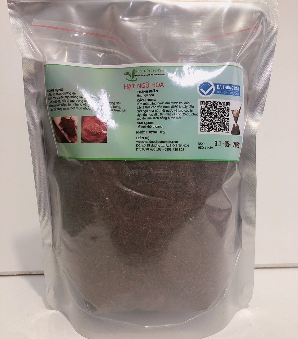 - Giúp làn da khoẻ mạnh, sáng đẹp Hạt ngũ hoa THÔNG TIN VỀ SẢN PHẨM Tên sản phẩm: Hạt ngũ hoa Nguồn gốc: Hưng Yên Ngày sản xuất: Ghi trên bào bì Hạn sử dụng: 12 tháng kể từ ngày sản xuất Hạt ngũ hoa CÁCH DÙNG HẠT NGŨ HOA Rửa mặt bằng nước ấm trước khi đắp Lấy 3 thìa cho vào nước 80°C khuấy đều chờ ngũ hoa hút hết nước và keo cục lại Lấy hổn hợp đắp lên mặt và chờ 25-30 phút sau đó rữa sạch bằng nước mát