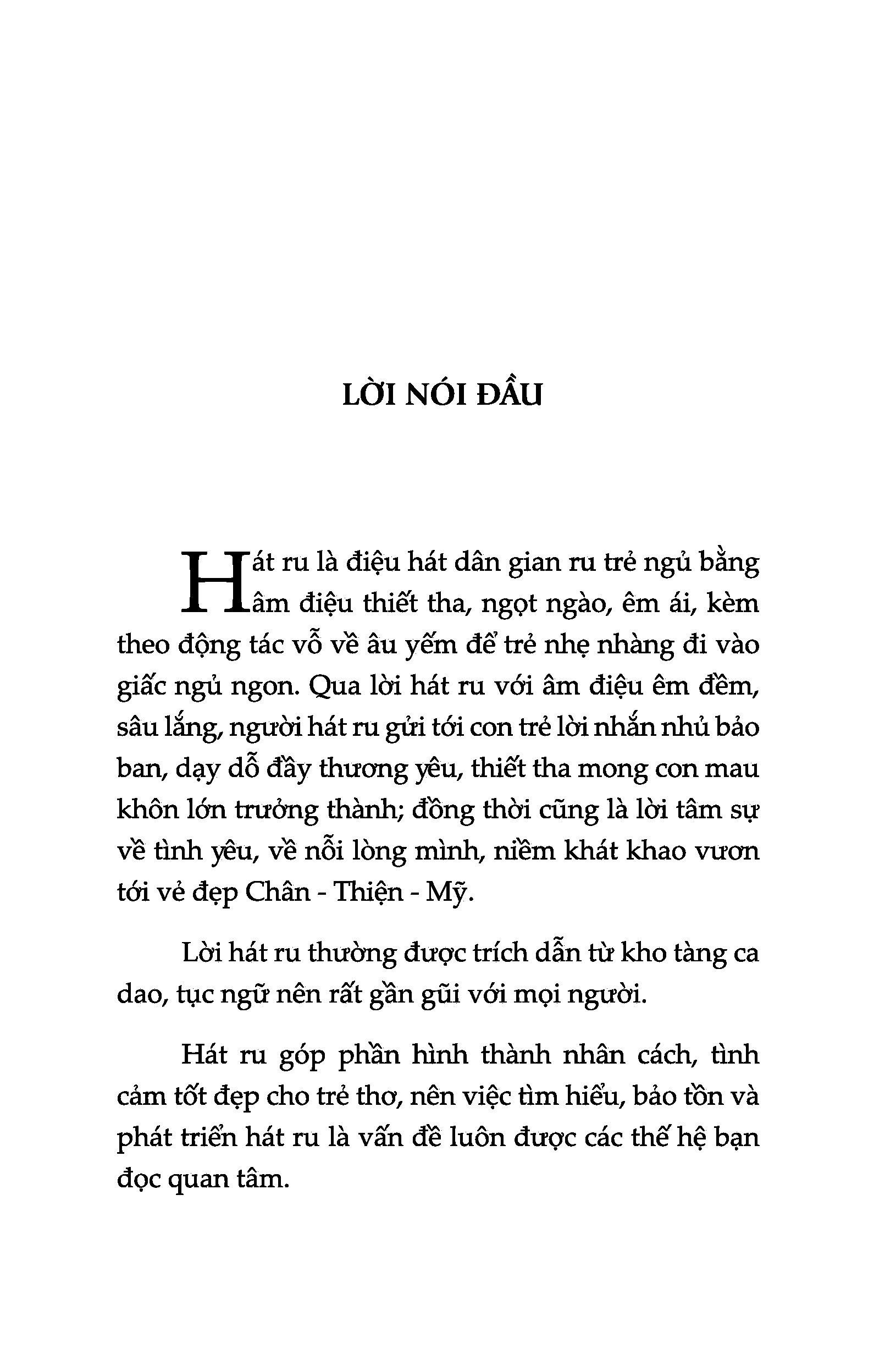 Hát ru – Tập hợp những câu hát thấm đượm tình quê hương là cuốn sách ghi lại những câu hát dân gian ru trẻ bằng những làn điệu thiết tha, ngọt ngào, êm ái. Nếu khéo léo kết hợp những lời hát ru này với những động tác vỗ về, âu yếm trẻ từ những người bà, người mẹ, trẻ sẽ nhẹ nhàng đi vào giấc ngủ ngon.